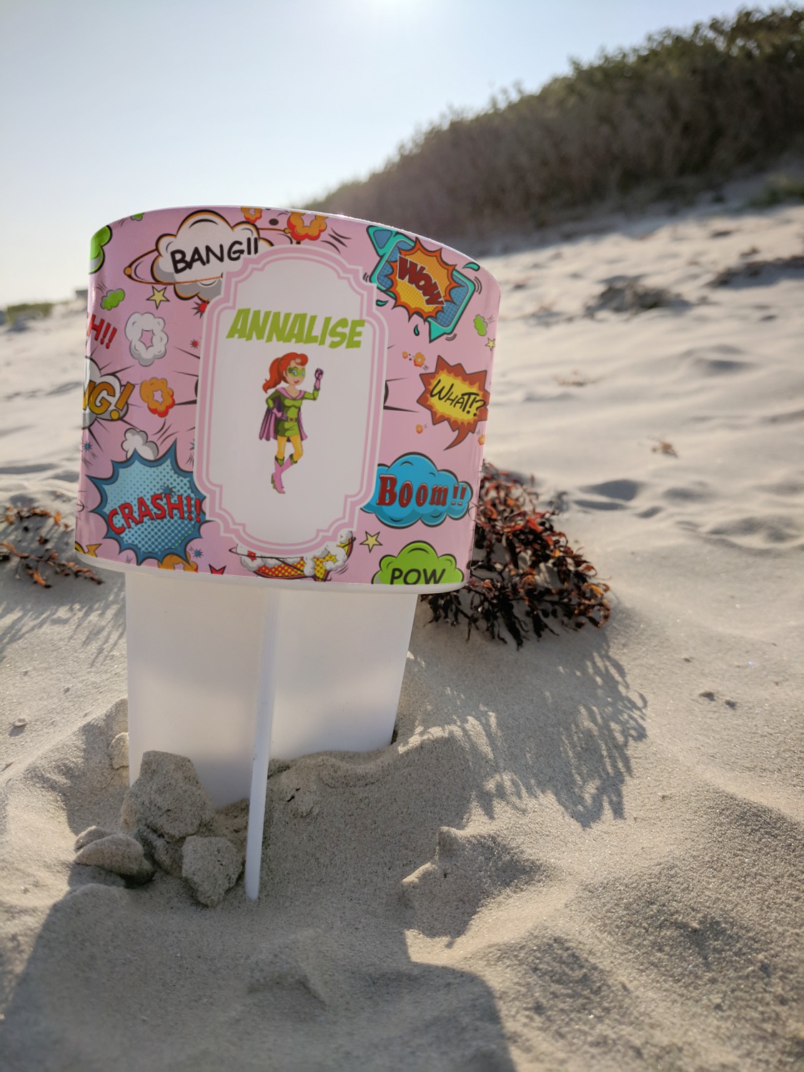 This cup holder has a large stake at its bottom that anchors it to the sand or ground below, while the cup holder rests above the stake. The entire drink holder is made of durable plastic and displays your customization around the cup holder portion. We sell these personalized beach spikers in two different colors: black and white.