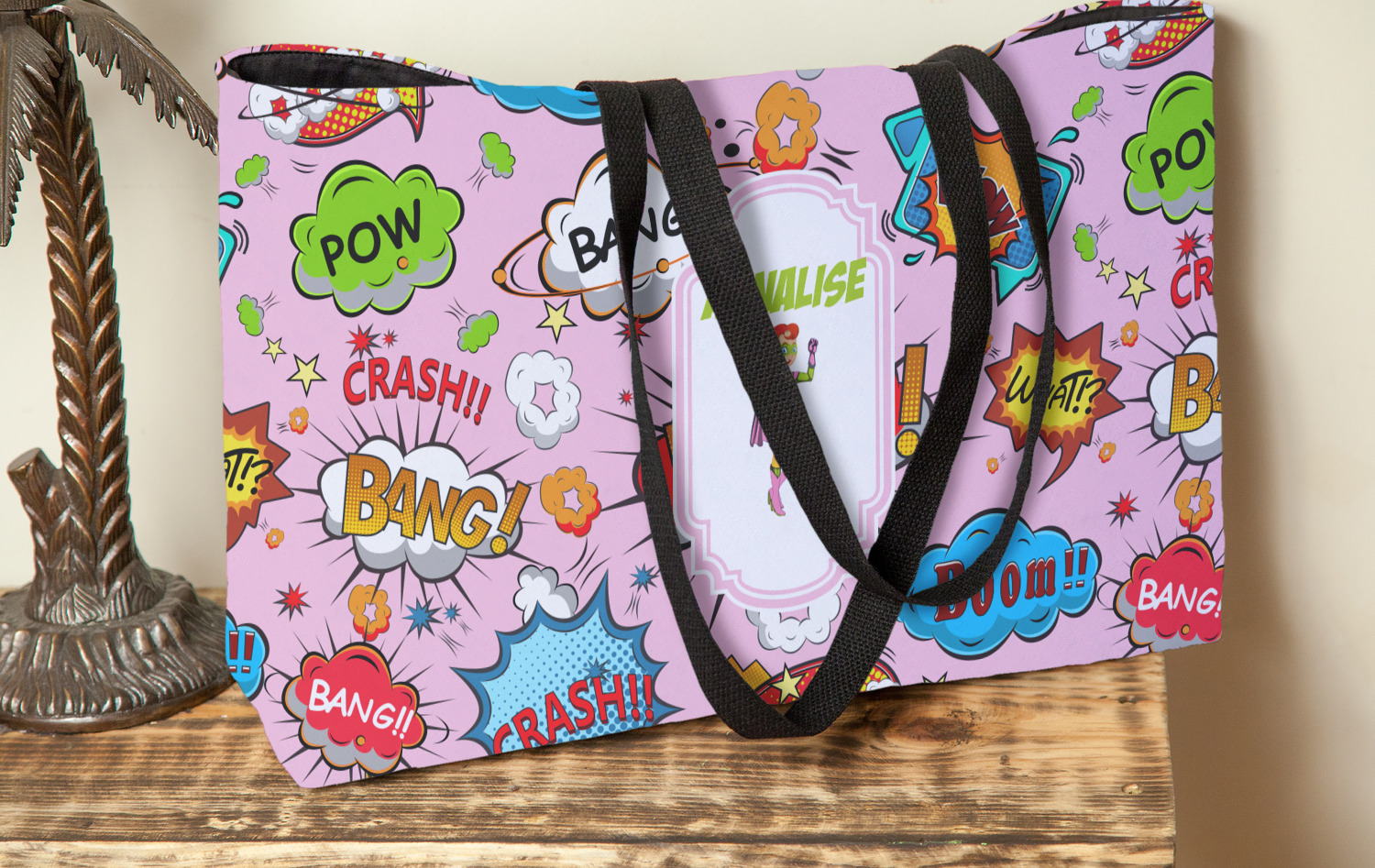 The totes are made from a sturdy canvas material on the outside and are lined with a black poly cotton lining. The beach totes have an approx. 28" black woven handles.