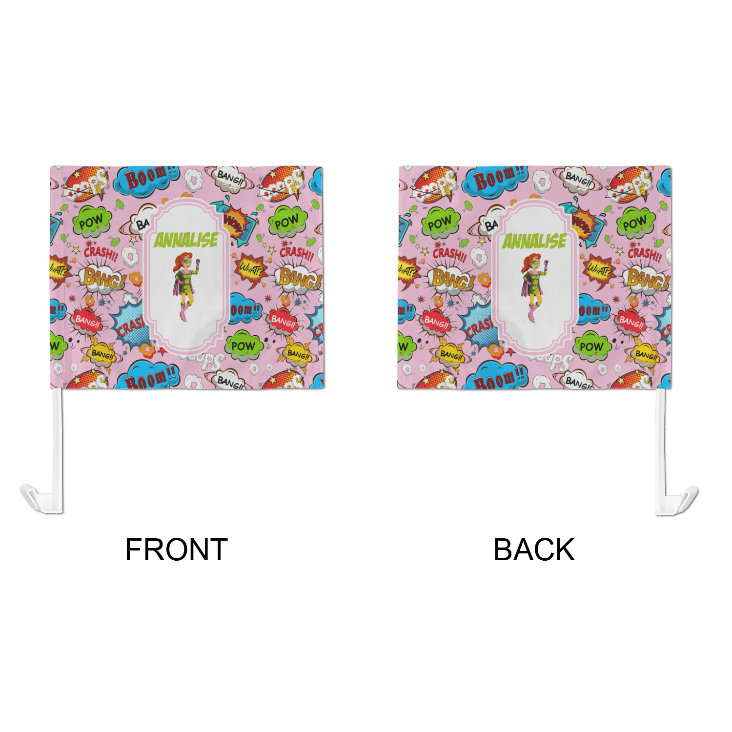 Our personalized flags are made from a durable, yet lightweight cloth that will proudly bear your logo or design of choice, while withstanding the outside elements. We have two size options - 8" x 11" and 11" x 15". Both come with a flag pole which includes a clip that secures the pole to the side window, whether it is rolled up or down. The flags are printed on both sides to display your design from all directions.