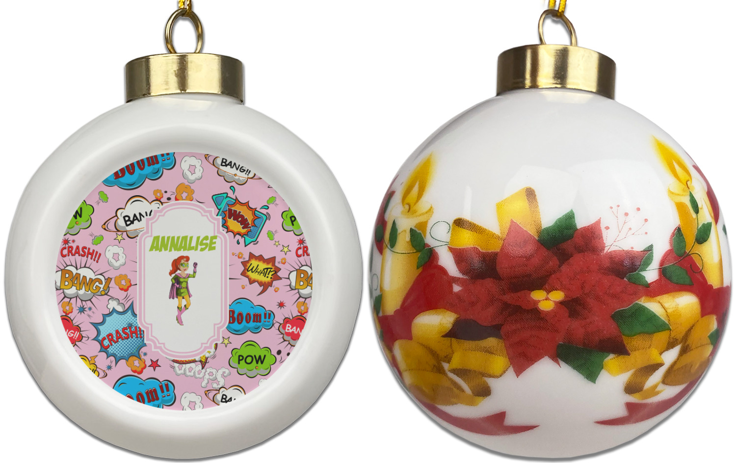 Our Christmas ornaments are a unique ceramic ball shape with a twist as it has a flat face to display your custom design! Select from one of our two design types - Christmas Tree or Poinsettia Garland - to adorn the curved back of your personal design. Each ornament measures 3H x 2.5W x 2D accompanied with a gold string accent for finishing touches to hang on your beautiful Christmas tree!