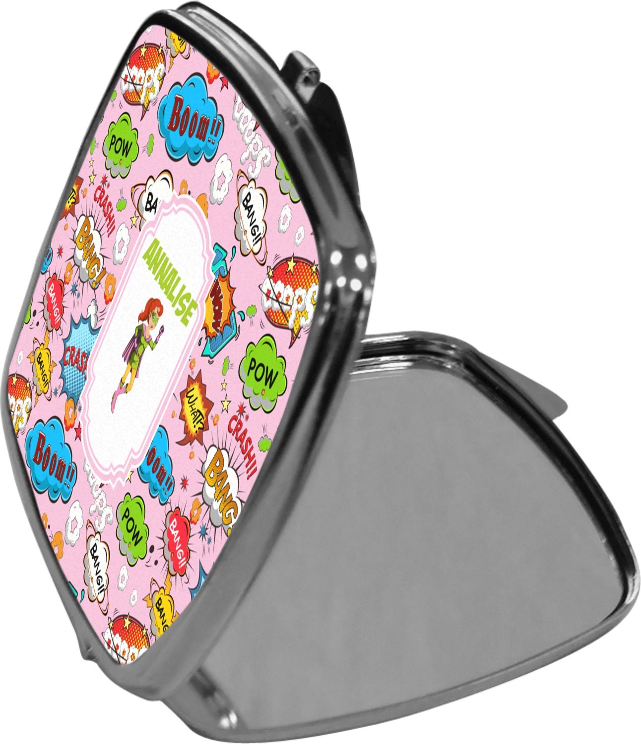 Our compact mirrors are customized with your design on one side. The other side is patterned silver tone metal. Inside, there are two mirrors.