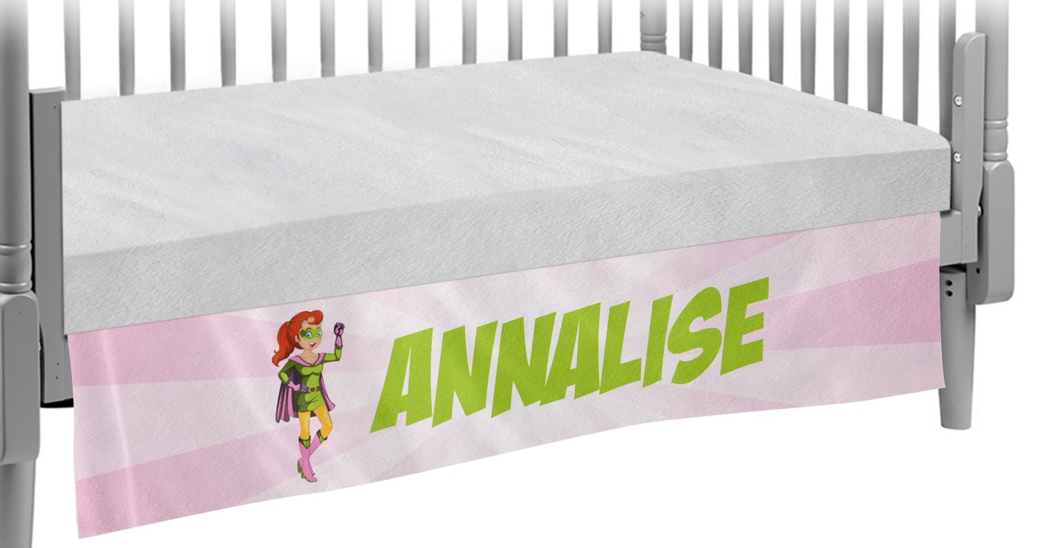 This baby crib skirt is made from two different materials and has split corners for easy placement and removal. The four corners are made from a soft, minky-like material, while the center is made of microfleece. The dual fabric makes this product durable, and still soft-to-the-touch. We provide you with the option of designing each of the four sides to be entirely unique, or to match one another, depending on your creative vision. Your personalization is displayed across the outside of the custom crib skirt, in vibrant colors. When inserted, each side panel drops 15" and is designed to touch the floor at its lowest setting.