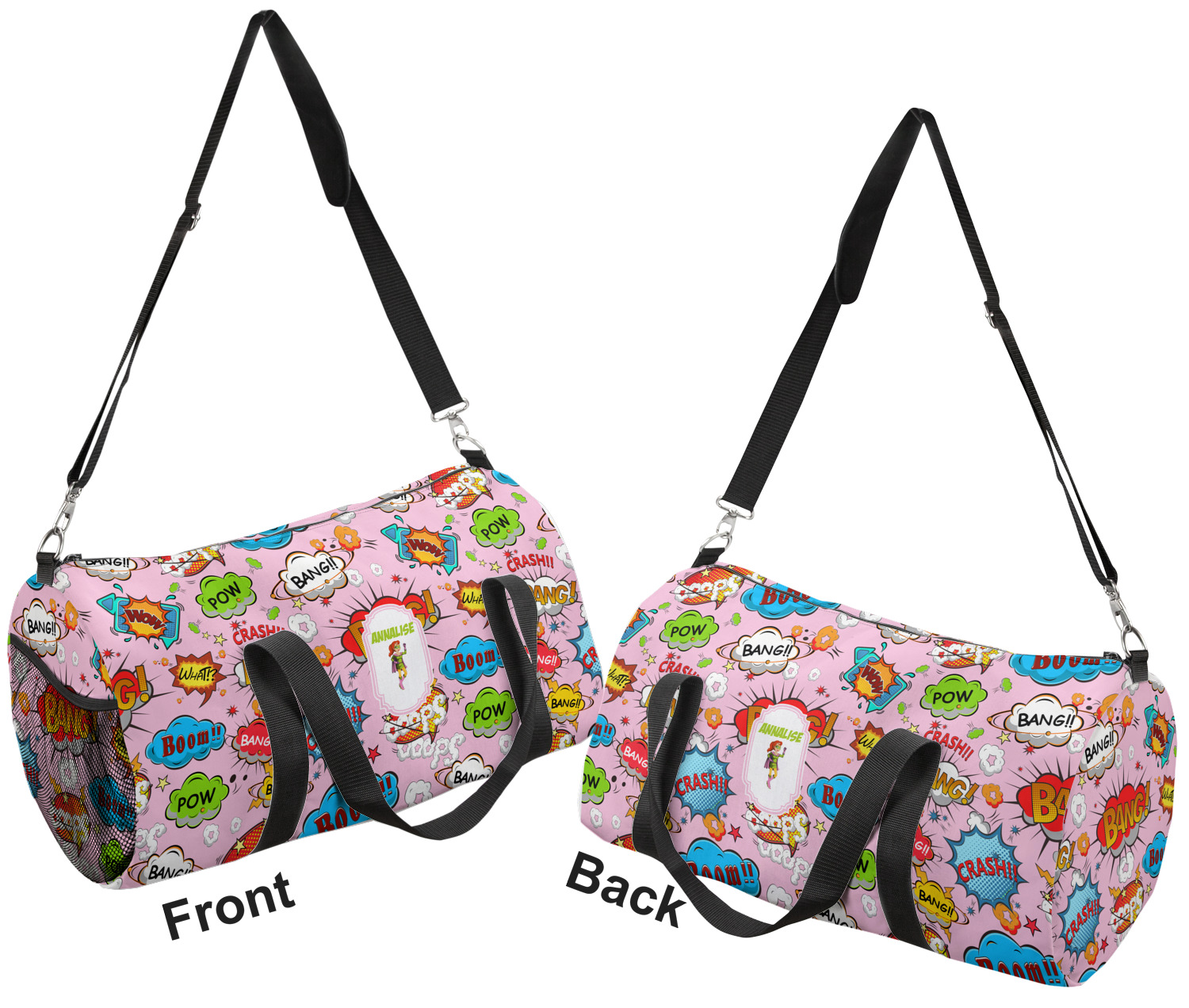 This duffle is a sturdy bag made of a canvas material. It comes in two sizes: Small (19"W x 9.5"H x 9.5"D) and Large (23"W x 12"H x 12"D). The bag is a cylindrical shape with a black adjustable strap and two handles. On one side is an elastic pouch to put a waterbottle or other small item. Your product will be sublimated with your design and is able to be designed on the front, back, and sides. Be sure to remember that the straps may cut into parts of your design if you upload your own artwork.