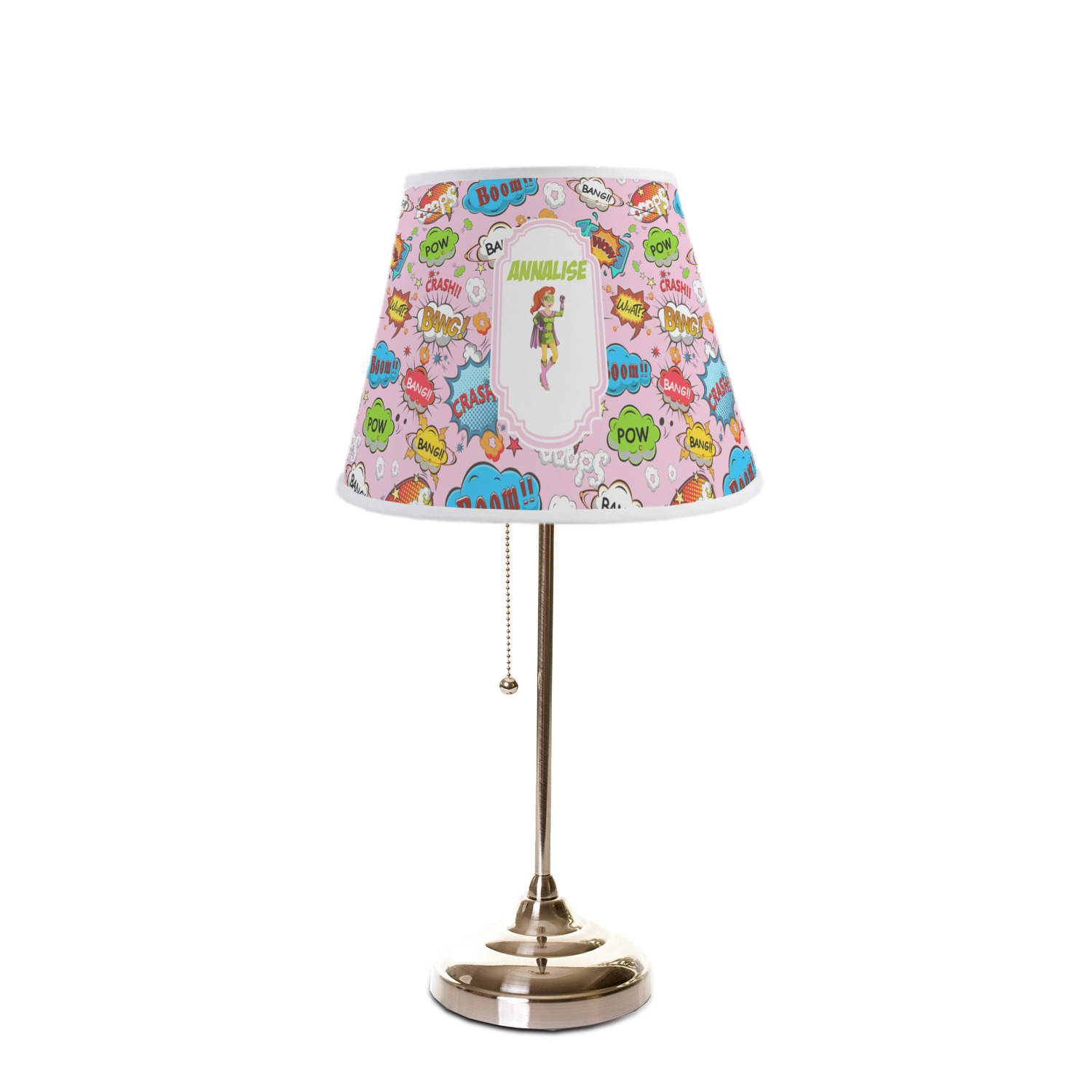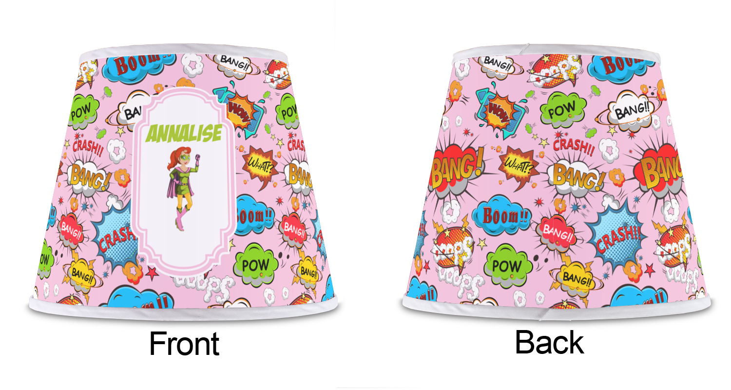 The base of this lampshade is 12 inches in diameter, and the top spans 8 inches in diameter. The total height of the lampshade is 10 inches. The angled nature of this custom lampshade concentrates the light, making it ideal for smaller spaces. This lampshade is made of matte, polyfilm, and displays your customization in its middle. The top and bottom of this colorful lamp shade are lined with a white fabric ribbon (which can be replaced with black inside the design studio) which frames your design and creates a sophisticated finish. As an UNO fitter lampshade, this unique lamp shade will fit a variety of bases.