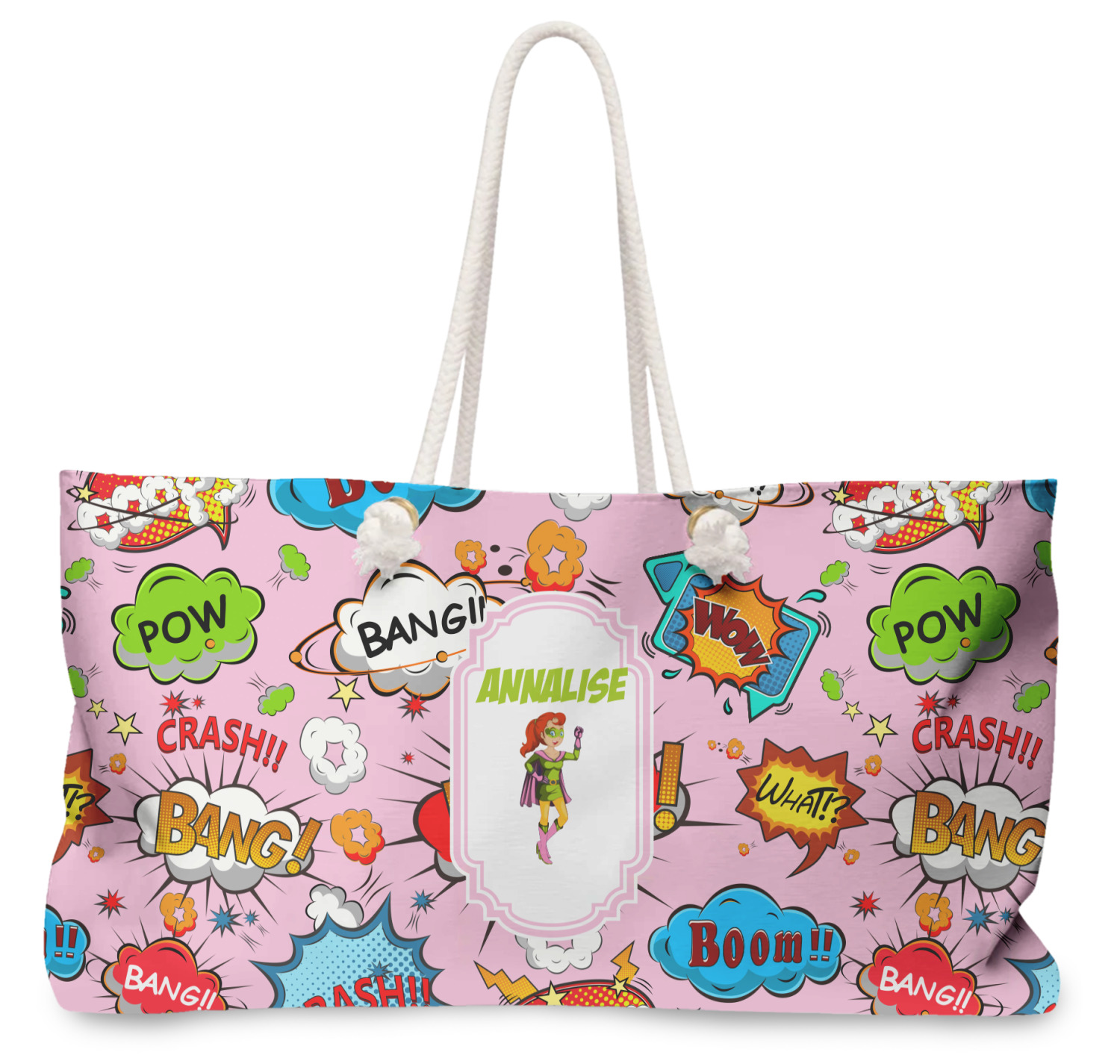 Our oversized weekender tote with rope handles is perfect for your weekend at the beach or on the town. This large tote are 24" W X 13" H, with a 5" gusset and a 27" thick rope handles with a knot that is put through a grommeted brass hole.