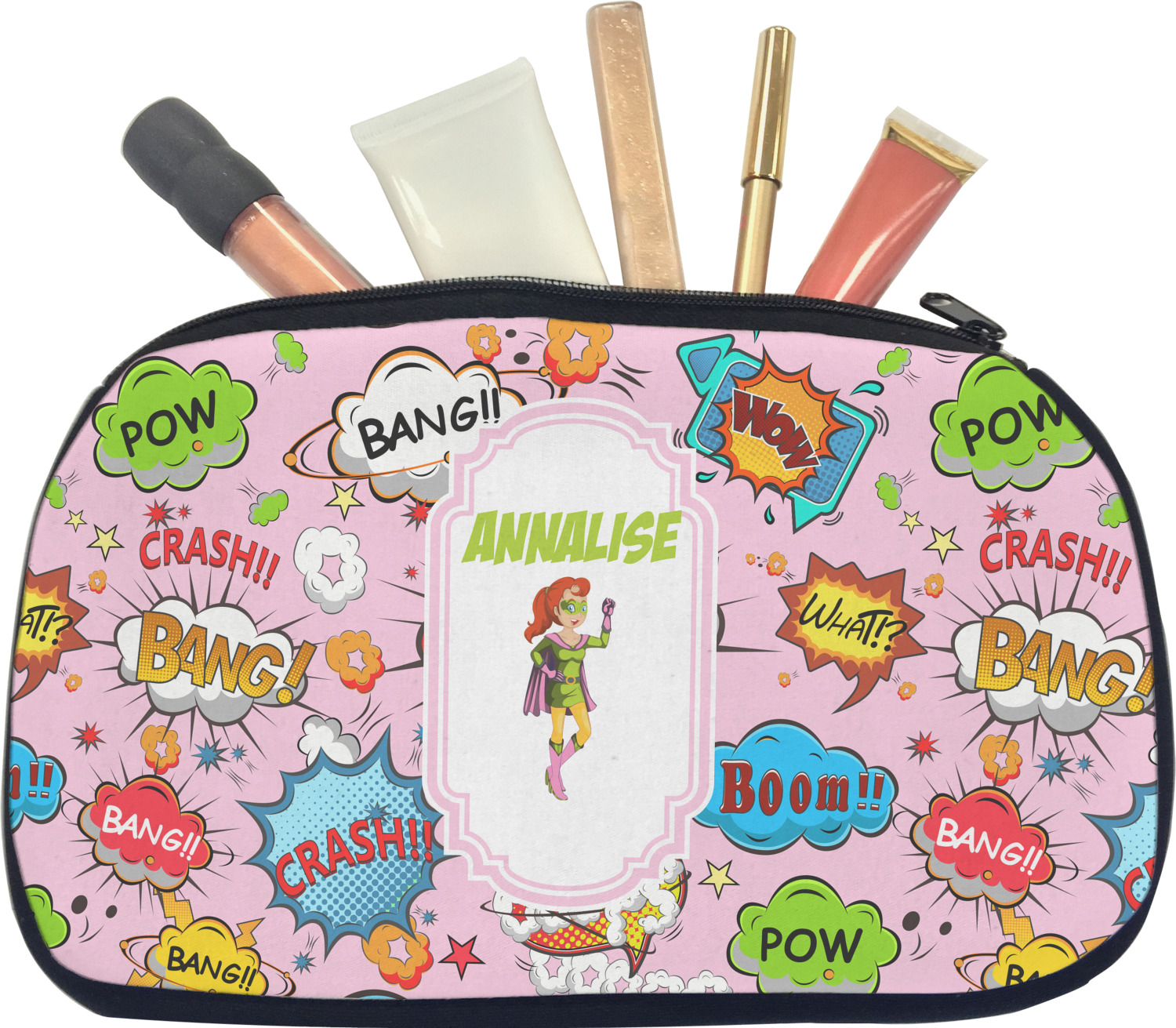 Our personalized makeup bags are available in many different designs, patterns and colors - so you are sure to find one that will love. They are made of neoprene (same material as wet-suits) and thus are water resistant, so spillages in your makeup bag will not end up all over you purse. They are customized on one side and are black on the other side and the zipper is black as well.