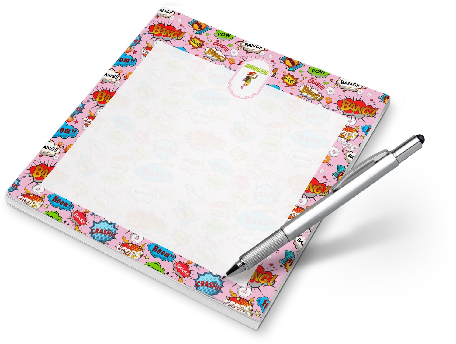 Your custom notepad features 50 sheets of thick, white paper, with your customization in the background and the edges. At approximately 6" x 5.5", these personalized memo pads are slightly larger than your average notepad. The individual notes tear easily from binding, which allows for quick, convenient, note-taking.