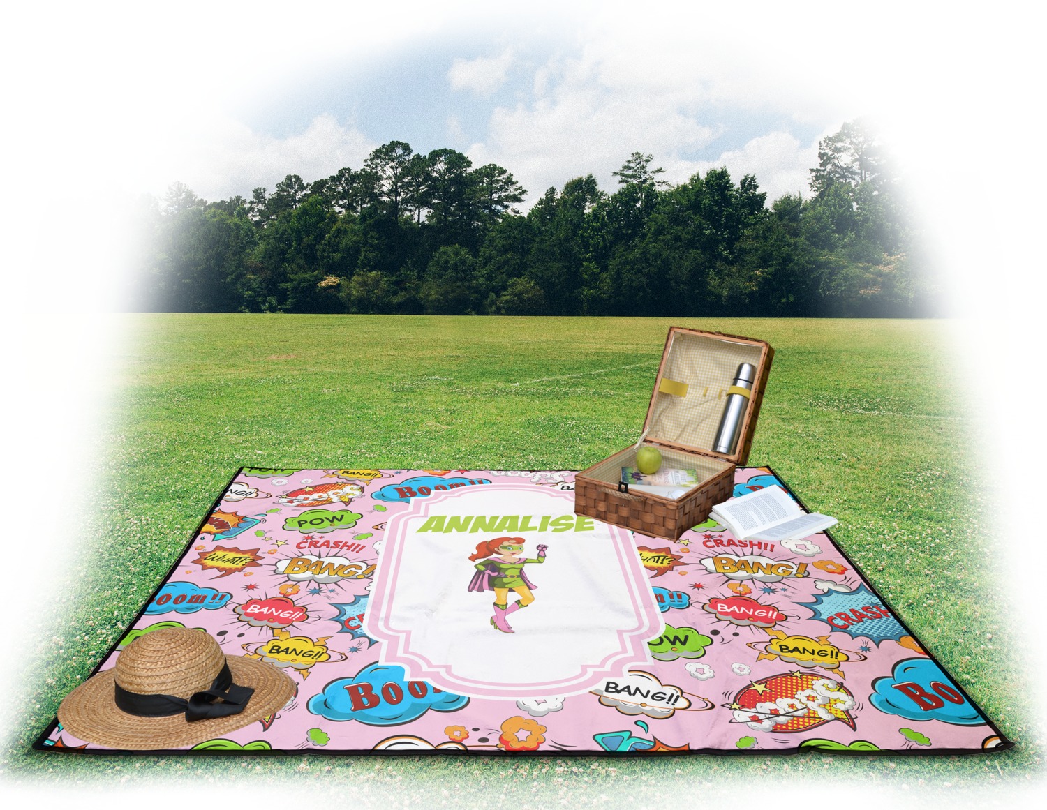 This picnic blanket is perfect for hanging out with your friends at the park or anywhere outside. The top of the blanket is made of a super soft microfiber fleece. The bottom of the blanket is made of a black material similar to a rain jacket and is water repellent as well. This will keep any wet spots on the ground from soaking through your picnic blanket. No one likes a wet blanket. The blanket measures at approximately 50" x 59" and has a nicely finished ribbon edge.