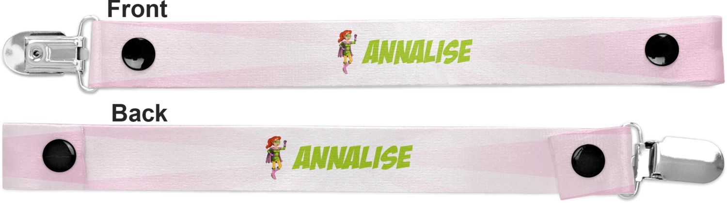 This personalized pacifier clip is the ideal size and measures at approximately 7.5 inches in length, when either end is snapped closed. On one end, you'll find a snap button. This button of your baby's pacifier holder is what can be attached to their pacifier to hold is securely in place. Simply open the snap, slip it through the pacifier opening, and snap it back into place. On the opposite end of this baby pacifier holder, you'll find a metal clip that can secure to a baby's collar or sleeve. This clip ensures that the strap stays in place, and that your baby's pacifier is always on hand.