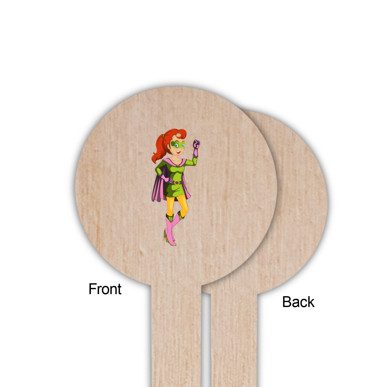 All our superhero women are fully re-color-able - so not only do you decide what color clothes they are wearing, you get to select their hair and skin color as well. So try out our customization system and see what you come up with. We chose a tall frame with the personalization on the top and colored it in matching pink.