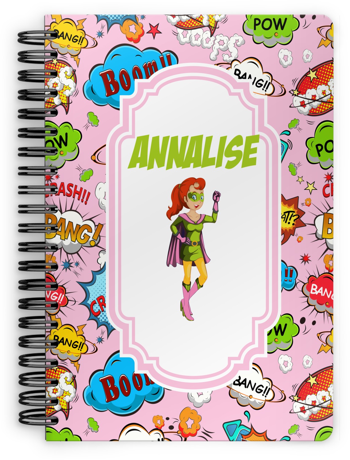This spiral notebook includes 75 sheets of thick, ruled paper. The front and back of this custom notebook is made of a robust, laminate, plastic covering. We print your personalization on these two panels, underneath a glossy finish, which emphasizes the colors of your design. The two panels and the sheets of paper are held together by a sturdy, black coil. The paper within your bound notebook is perforated for easy, clean tearing.