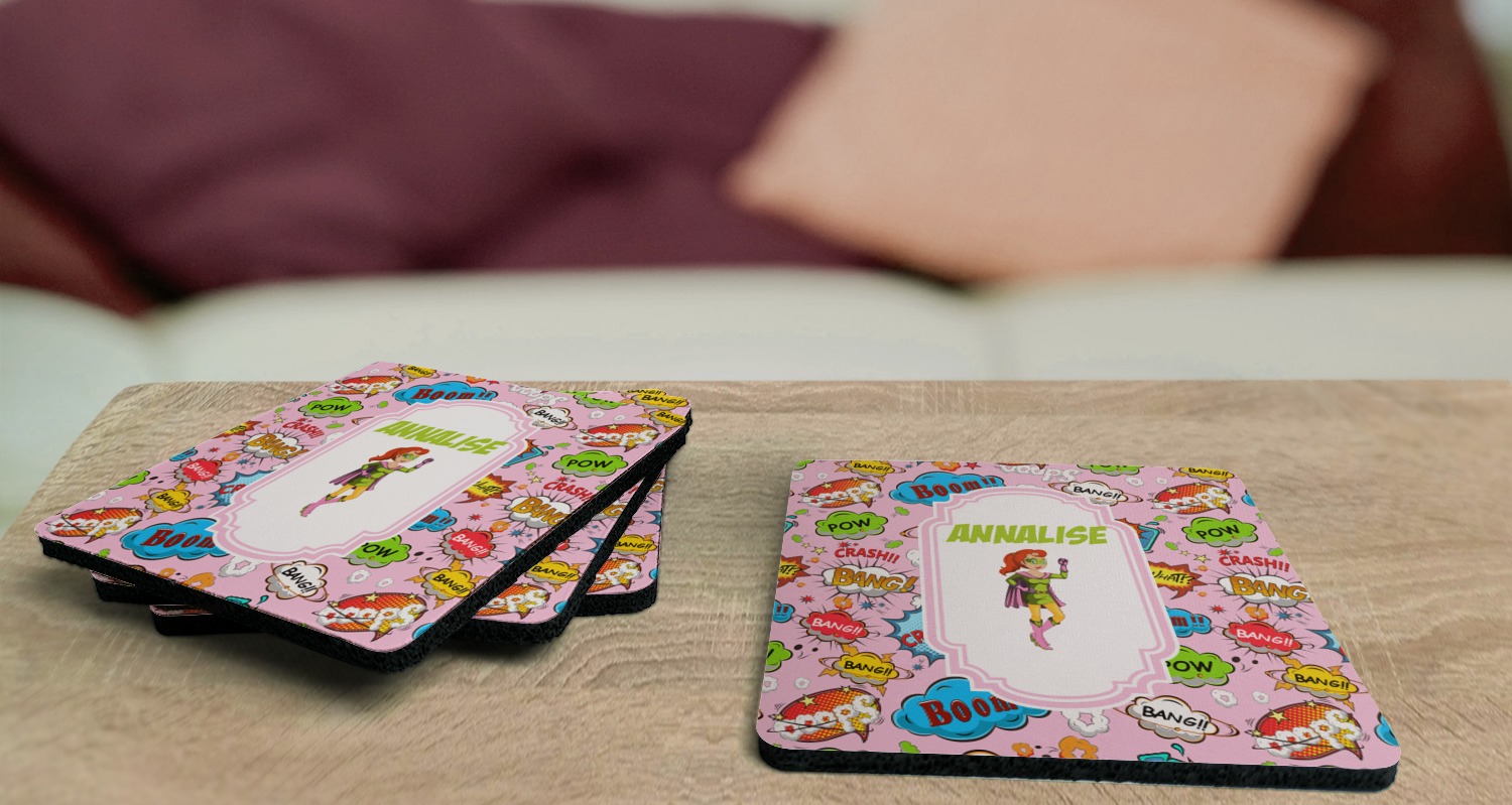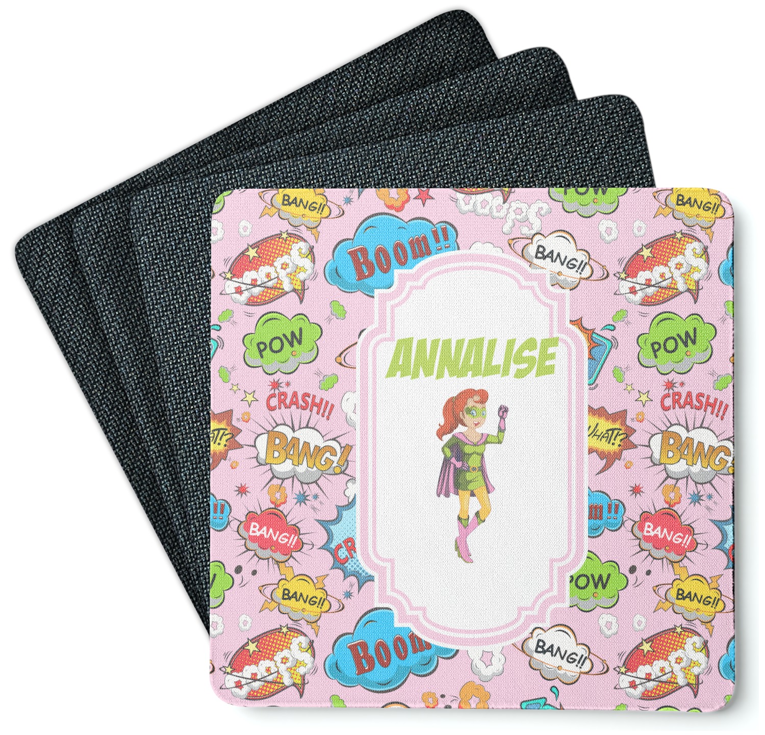 These drink coasters have a smooth, polyester top and a textured, rubber backing on its bottom. The non-slip rubber backing underneath works to keep any spills at bay. At 4 by 4 by 0.25 inches thick, these custom coasters are a suitable size for most drinkware. Your personalization is displayed atop the face of the cup coaster. We sell these rubber coasters in two different shapes: square and round. You can buy each shape as singulars or as a set of 4.