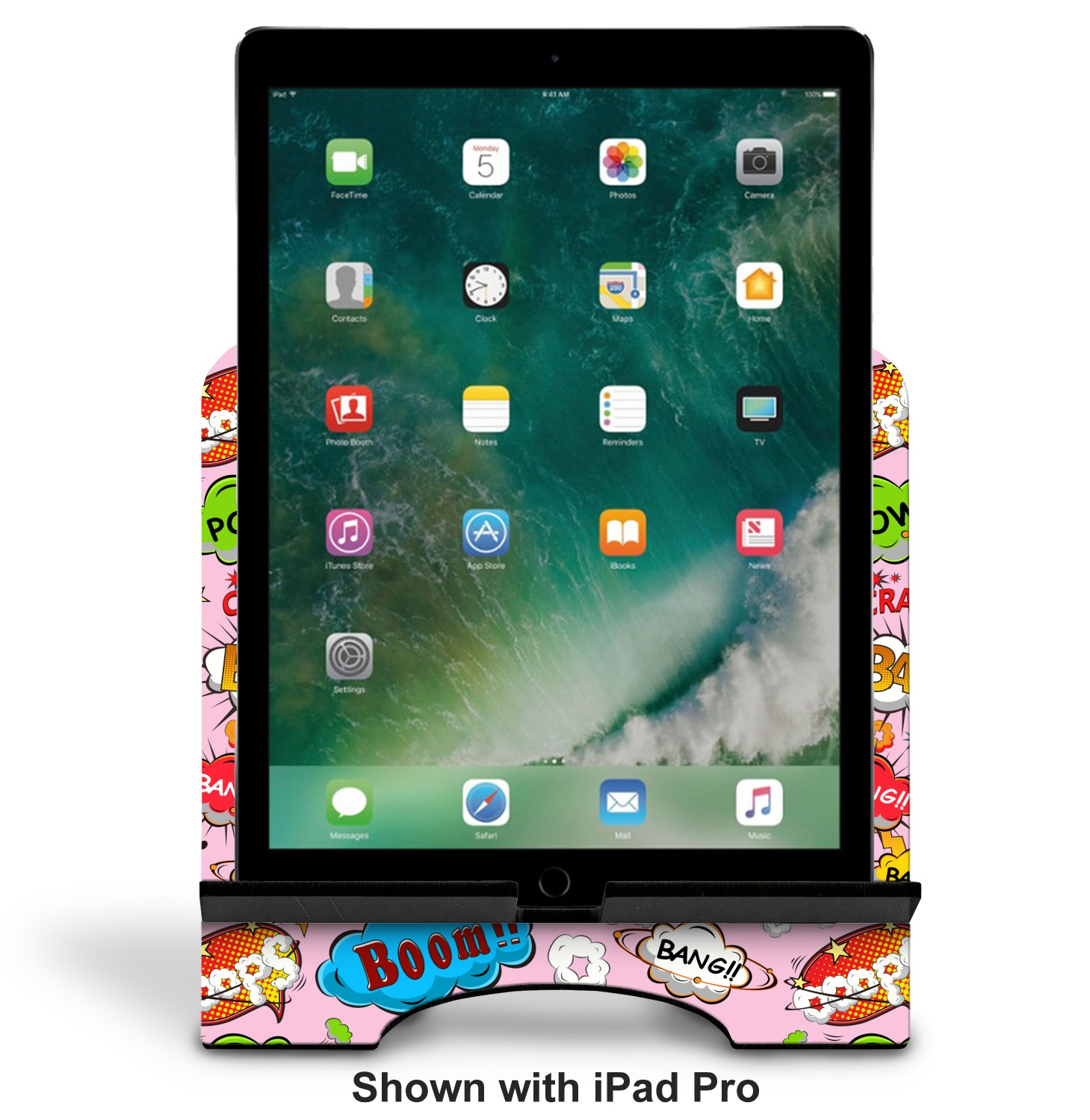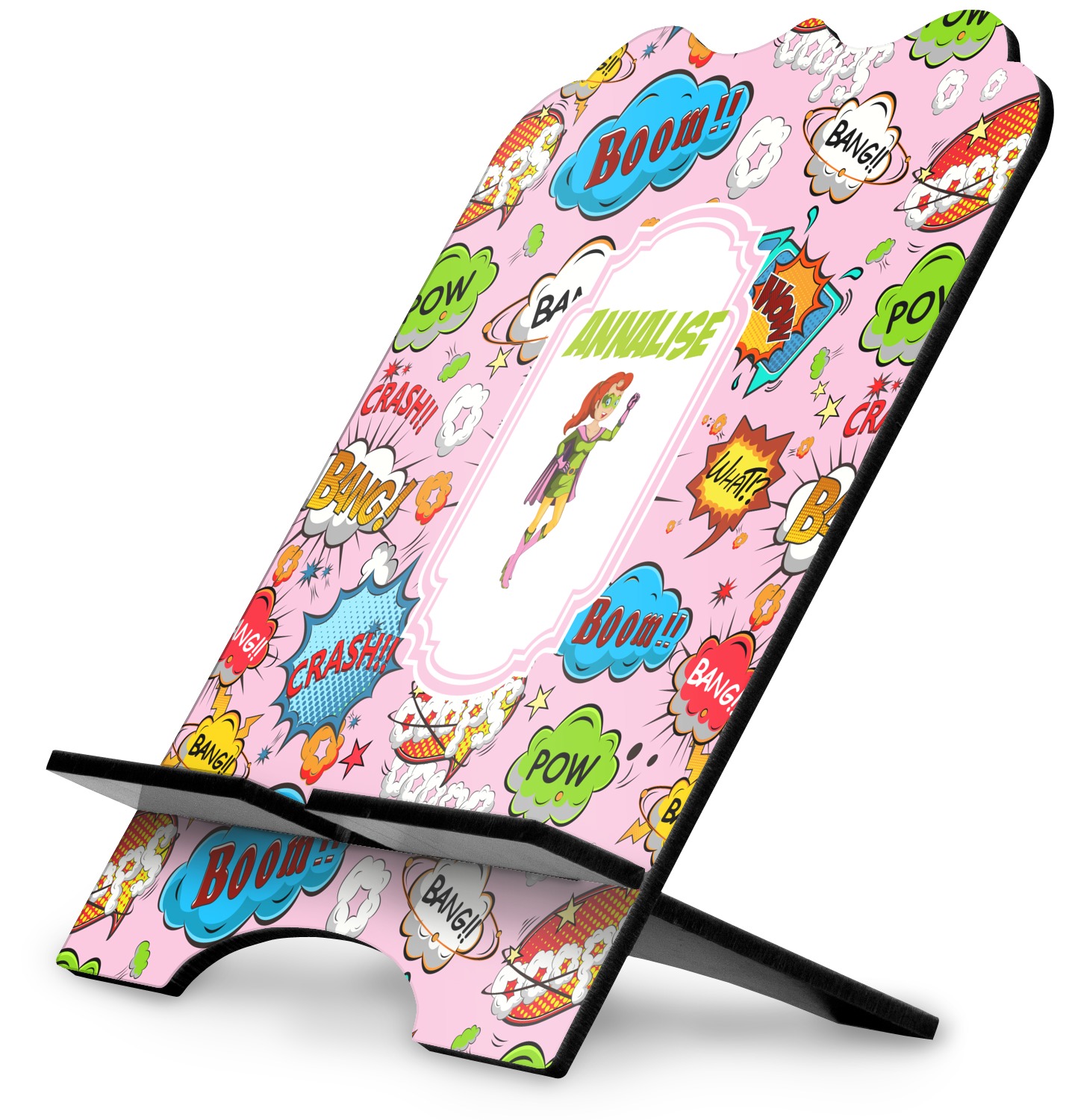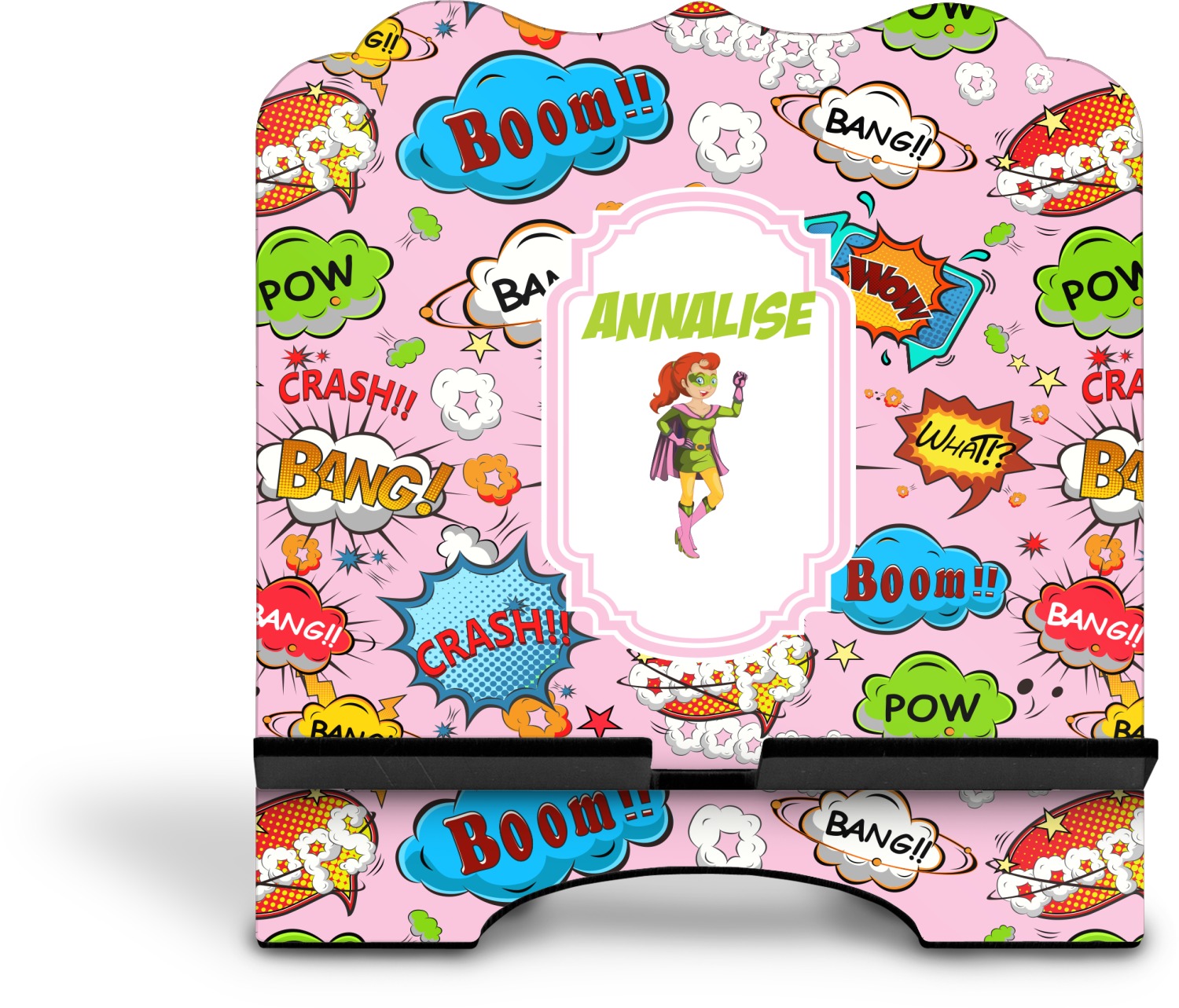 The stand is comprised of two hardboard pieces that fit snugly together and stabilize one another. The bottom part of the iPad stand supports your tablet, and has space for your tablets charger while in use. At 9.25" x 11.5", this tablet mount can support a device between the sizes of the iPad Pro and the iPad Mini 2. The uppermost part of the stand features a decorative, curved edge for a classy, suave appearance. We print your customization atop the face of the stand, in vibrant color. The remaining sides are colored a sleek black.