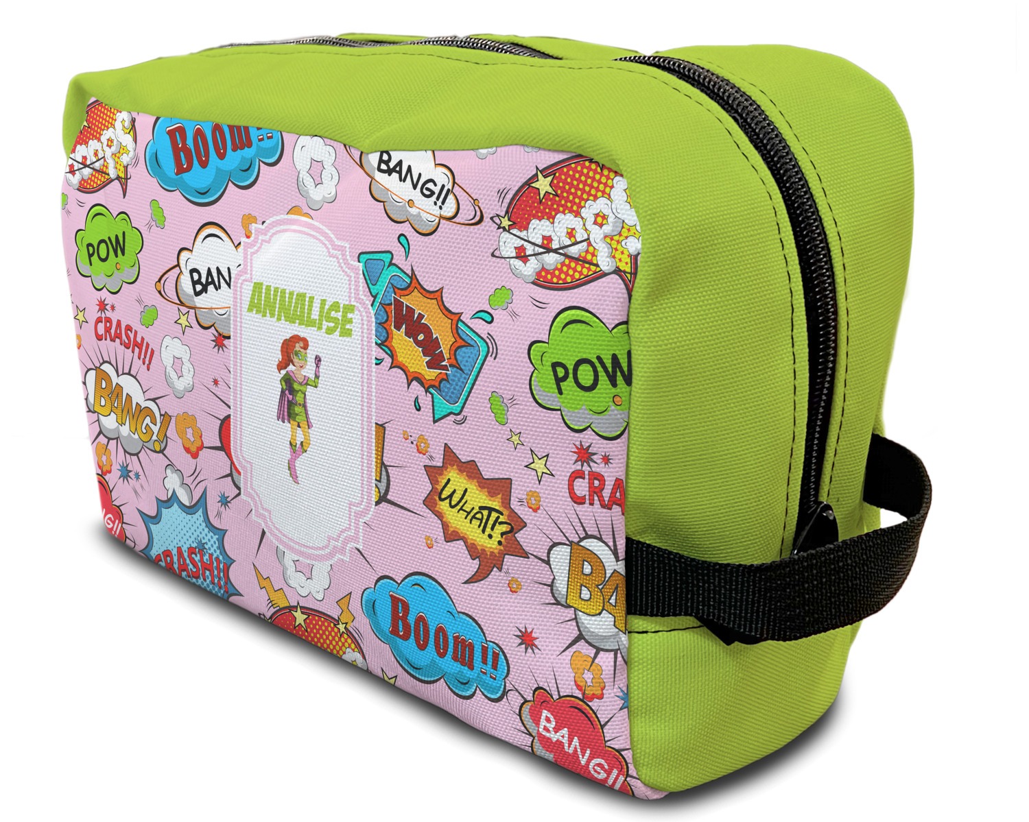 Our toiletry bag has the traditional dopp kit design i.e. a side to side zippered closure, giving you easy access to all the contents inside and a sturdy handle on one side of the bag. The canvas fabric for dopp kits is printed, then cut and sewn here in the USA.