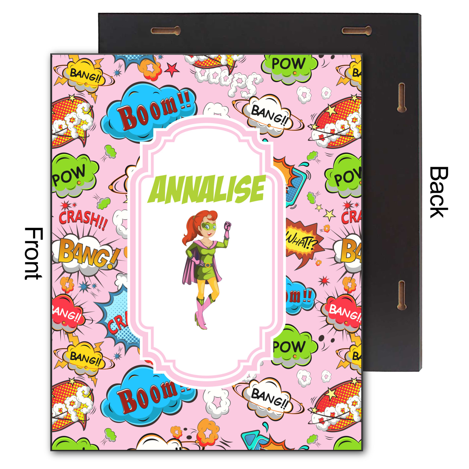 All our superhero women are fully re-color-able - so not only do you decide what color clothes they are wearing, you get to select their hair and skin color as well. So try out our customization system and see what you come up with. We chose a tall frame with the personalization on the top and colored it in matching pink.