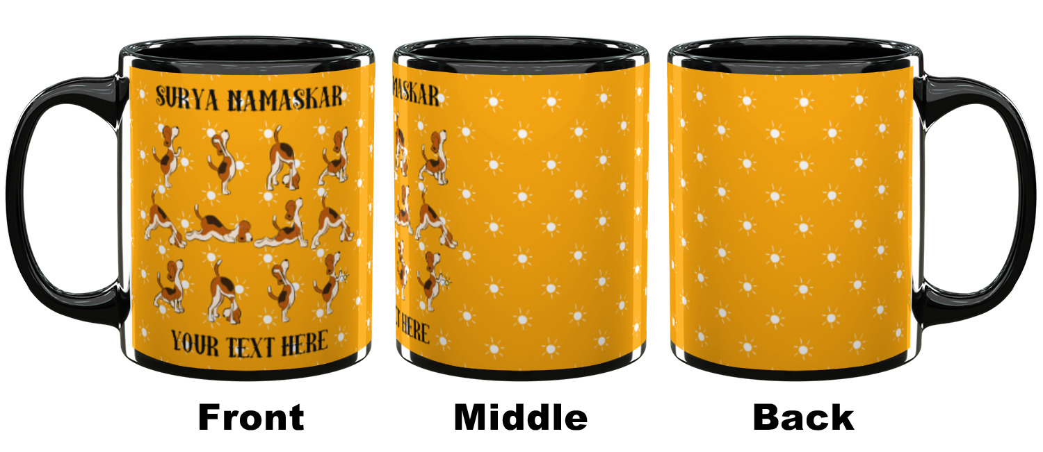 This design has a bright and happy background with little suns that are light yellow, while the rest is a slightly darker bright yellow. The main piece of the design is the set of adorable dogs doing yoga in several different positions. Your personalization goes above and below these graphics.