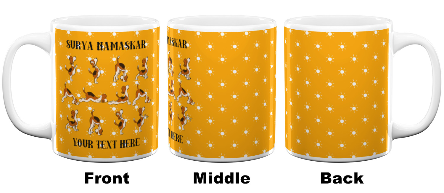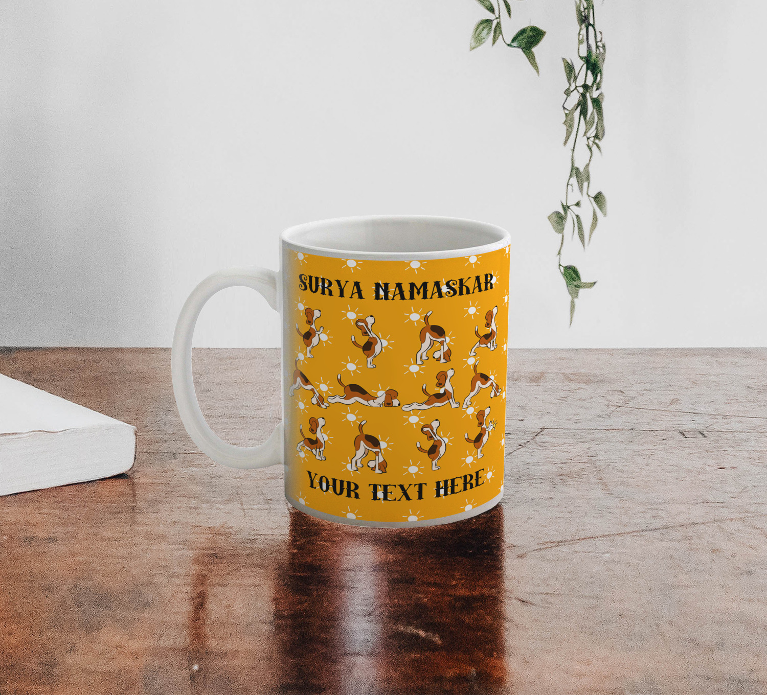 This design has a bright and happy background with little suns that are light yellow, while the rest is a slightly darker bright yellow. The main piece of the design is the set of adorable dogs doing yoga in several different positions. Your personalization goes above and below these graphics.