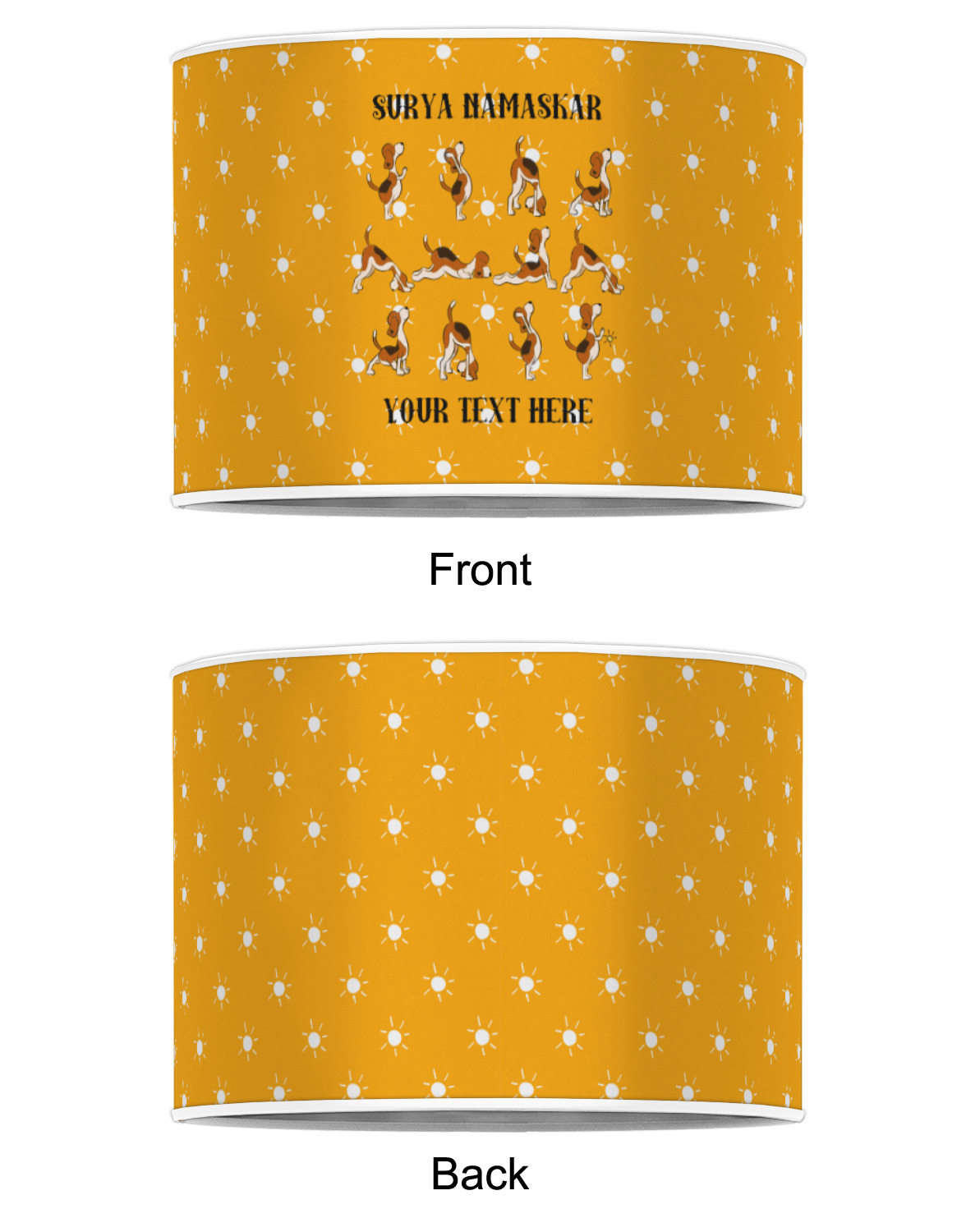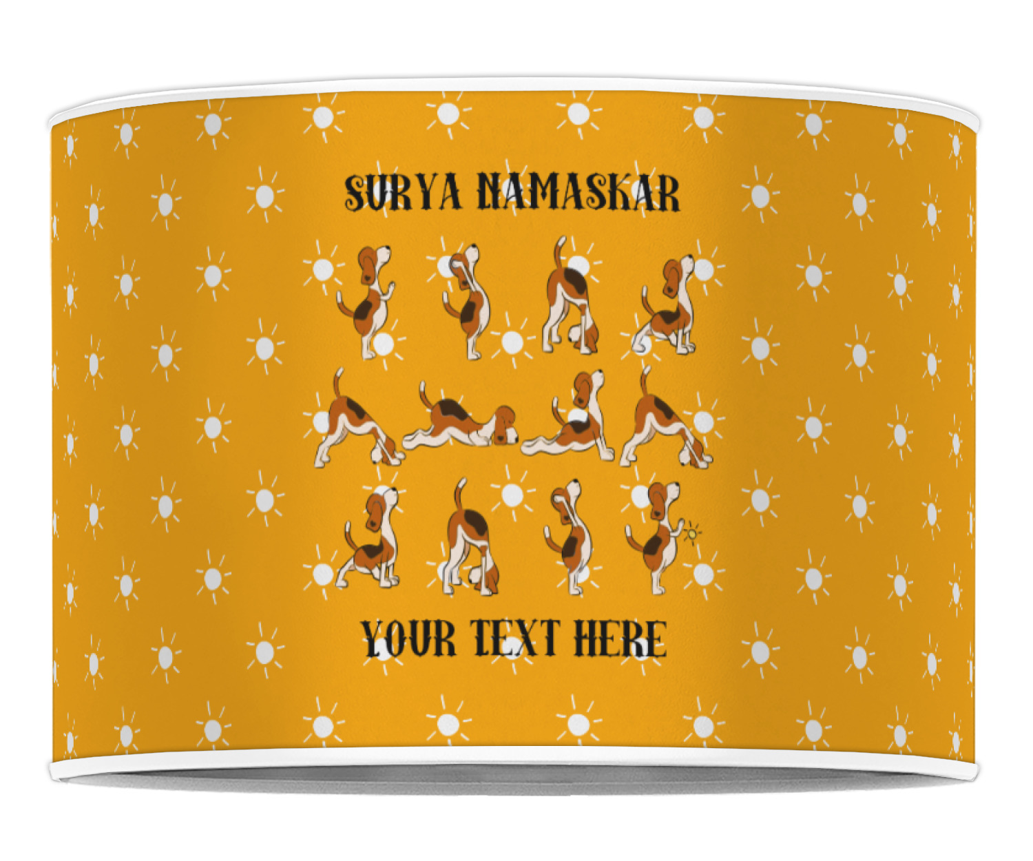 This design has a bright and happy background with little suns that are light yellow, while the rest is a slightly darker bright yellow. The main piece of the design is the set of adorable dogs doing yoga in several different positions. Your personalization goes above and below these graphics.