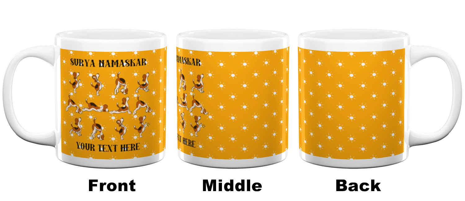 This design has a bright and happy background with little suns that are light yellow, while the rest is a slightly darker bright yellow. The main piece of the design is the set of adorable dogs doing yoga in several different positions. Your personalization goes above and below these graphics.