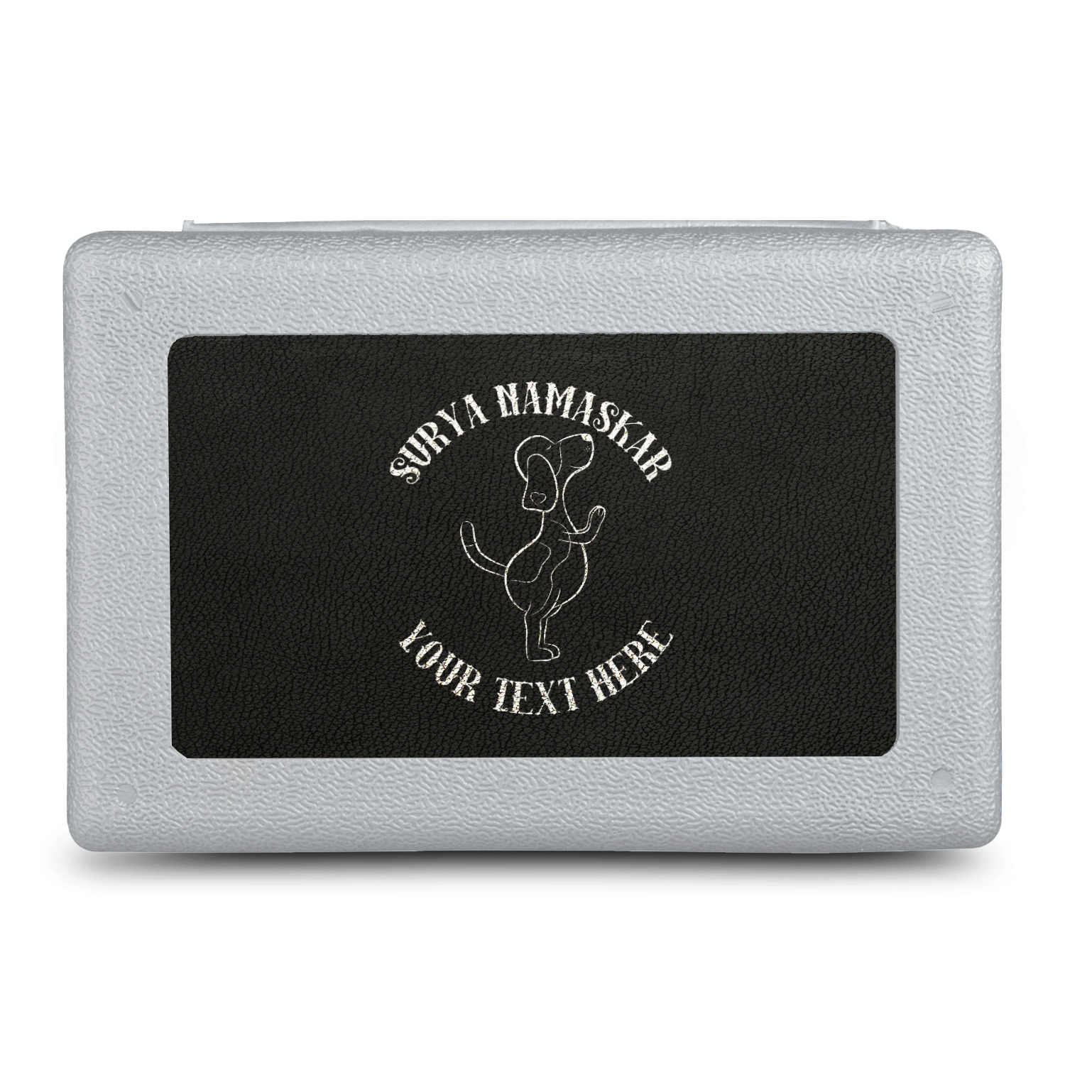This design has a bright and happy background with little suns that are light yellow, while the rest is a slightly darker bright yellow. The main piece of the design is the set of adorable dogs doing yoga in several different positions. Your personalization goes above and below these graphics.