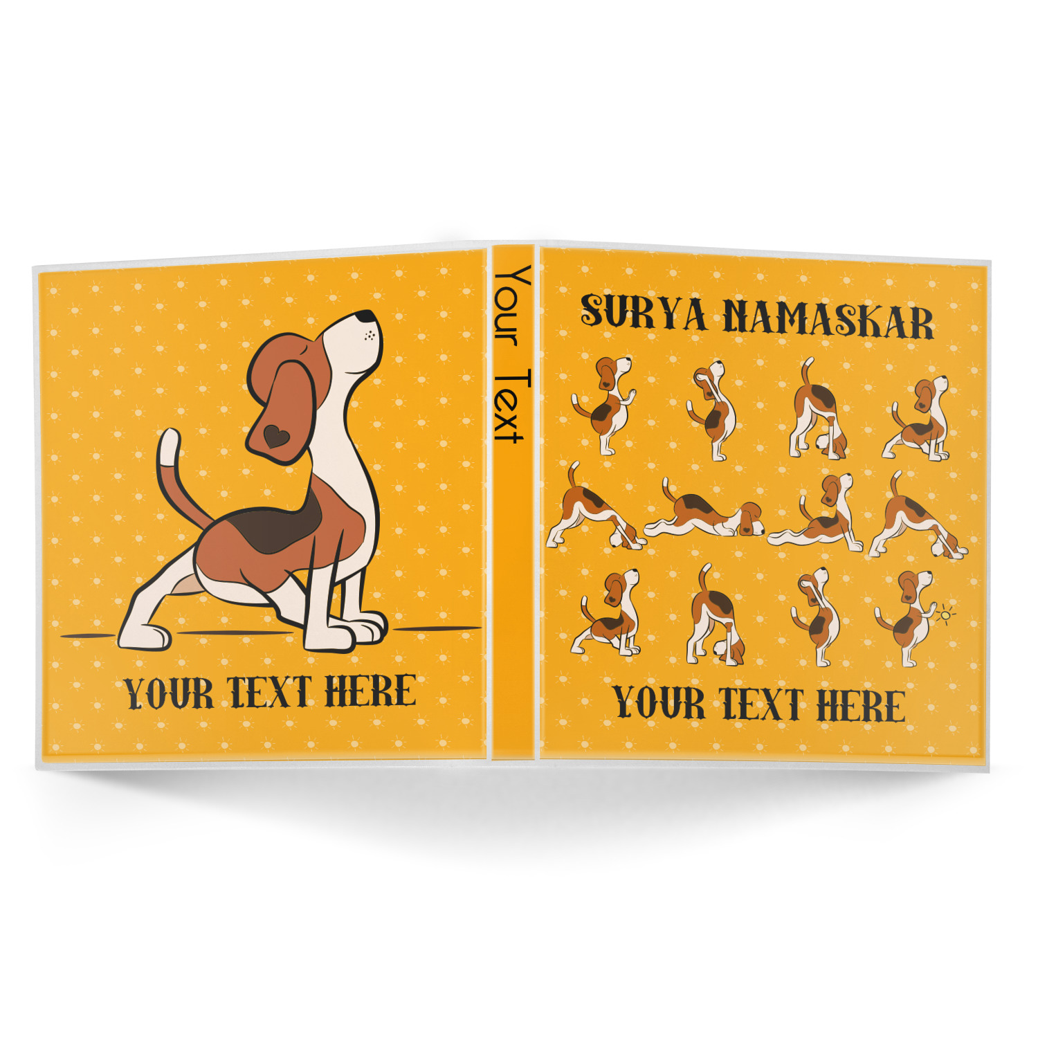 This design has a bright and happy background with little suns that are light yellow, while the rest is a slightly darker bright yellow. The main piece of the design is the set of adorable dogs doing yoga in several different positions. Your personalization goes above and below these graphics.