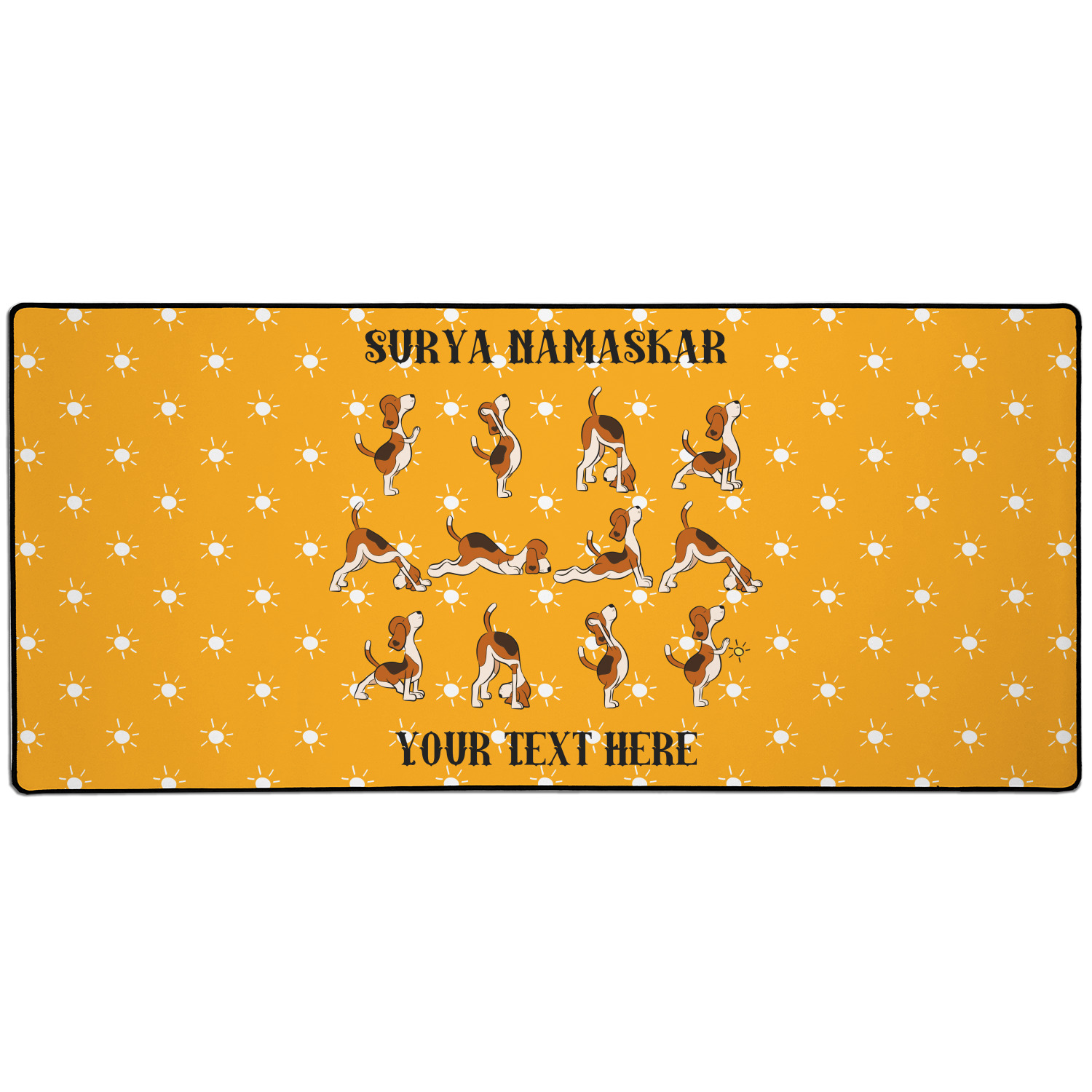 This design has a bright and happy background with little suns that are light yellow, while the rest is a slightly darker bright yellow. The main piece of the design is the set of adorable dogs doing yoga in several different positions. Your personalization goes above and below these graphics.