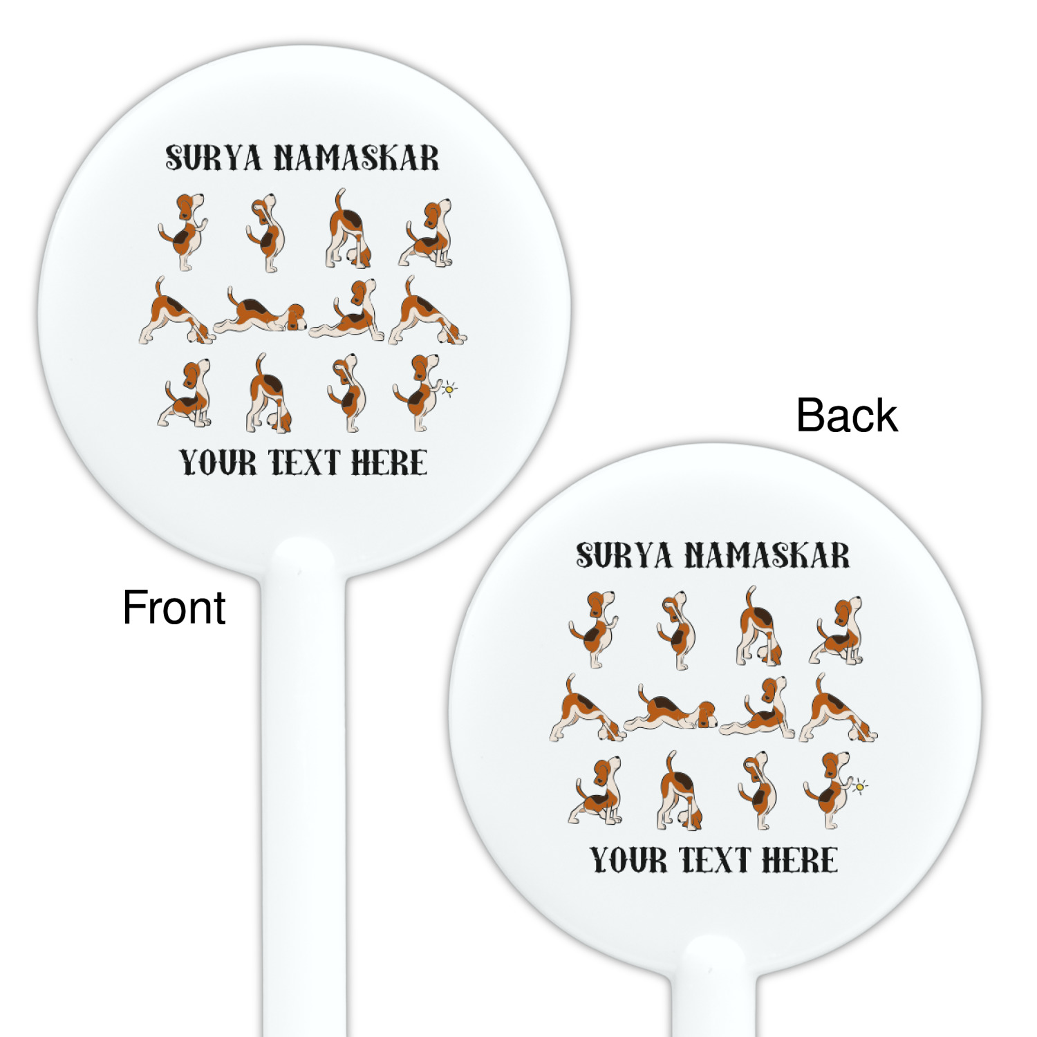This design has a bright and happy background with little suns that are light yellow, while the rest is a slightly darker bright yellow. The main piece of the design is the set of adorable dogs doing yoga in several different positions. Your personalization goes above and below these graphics.