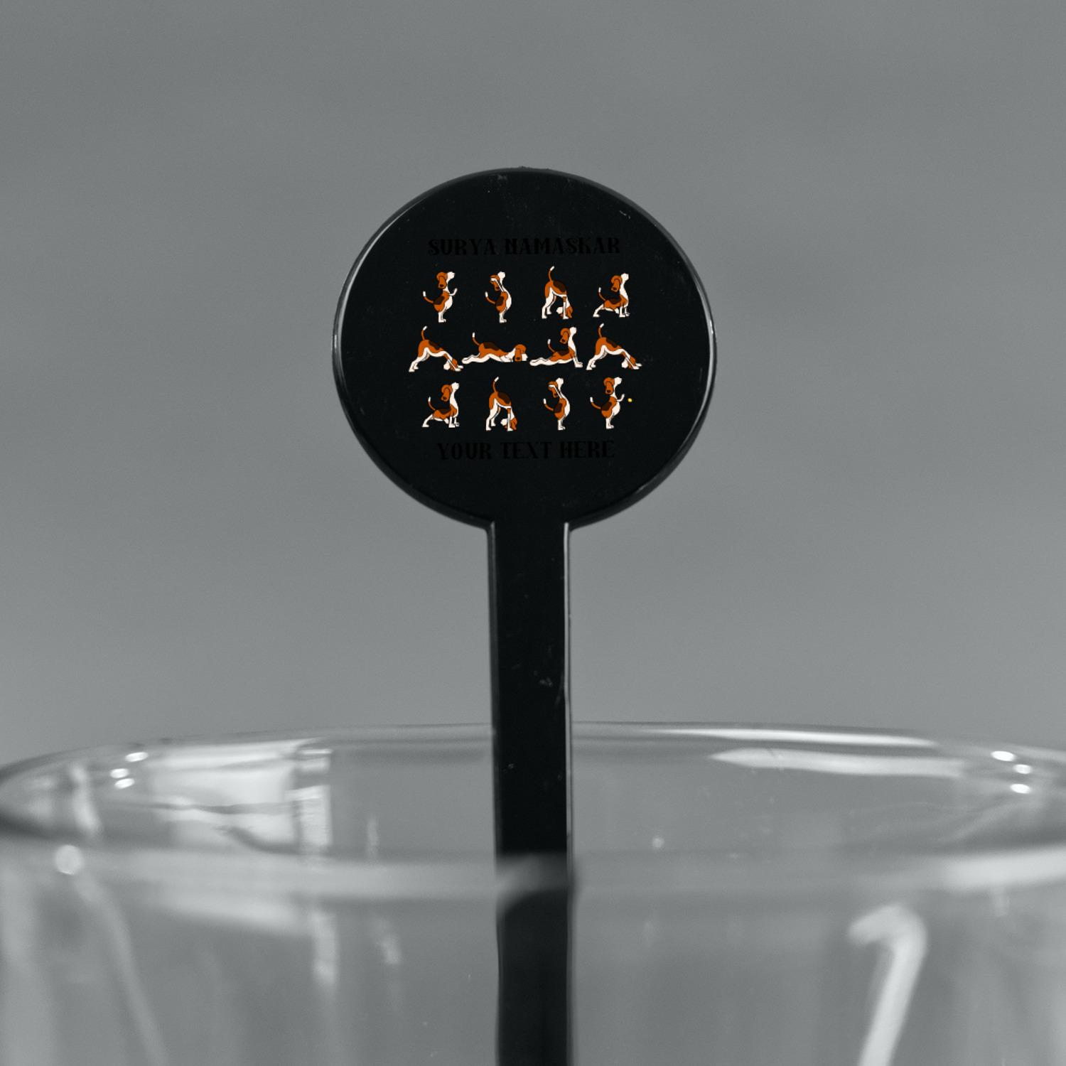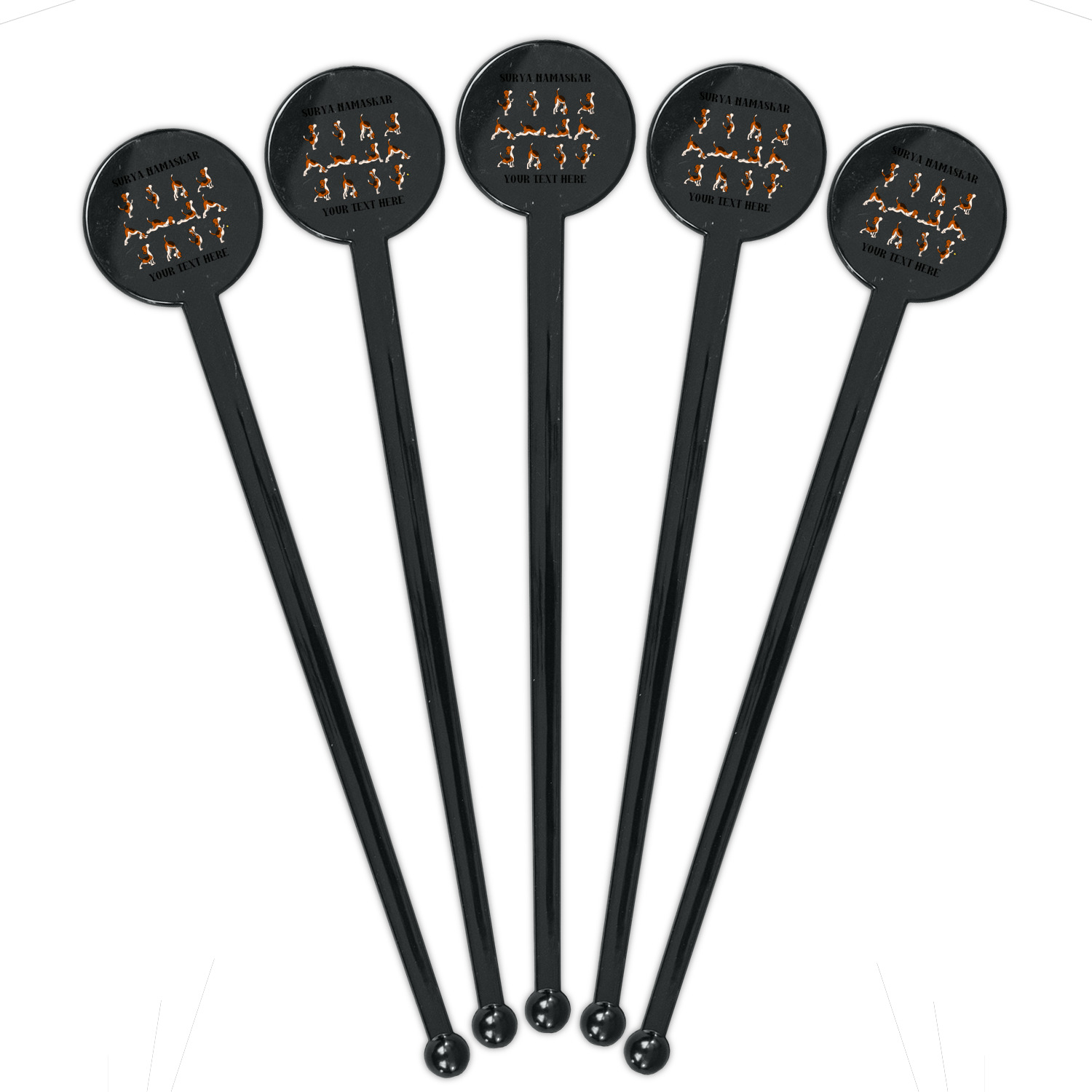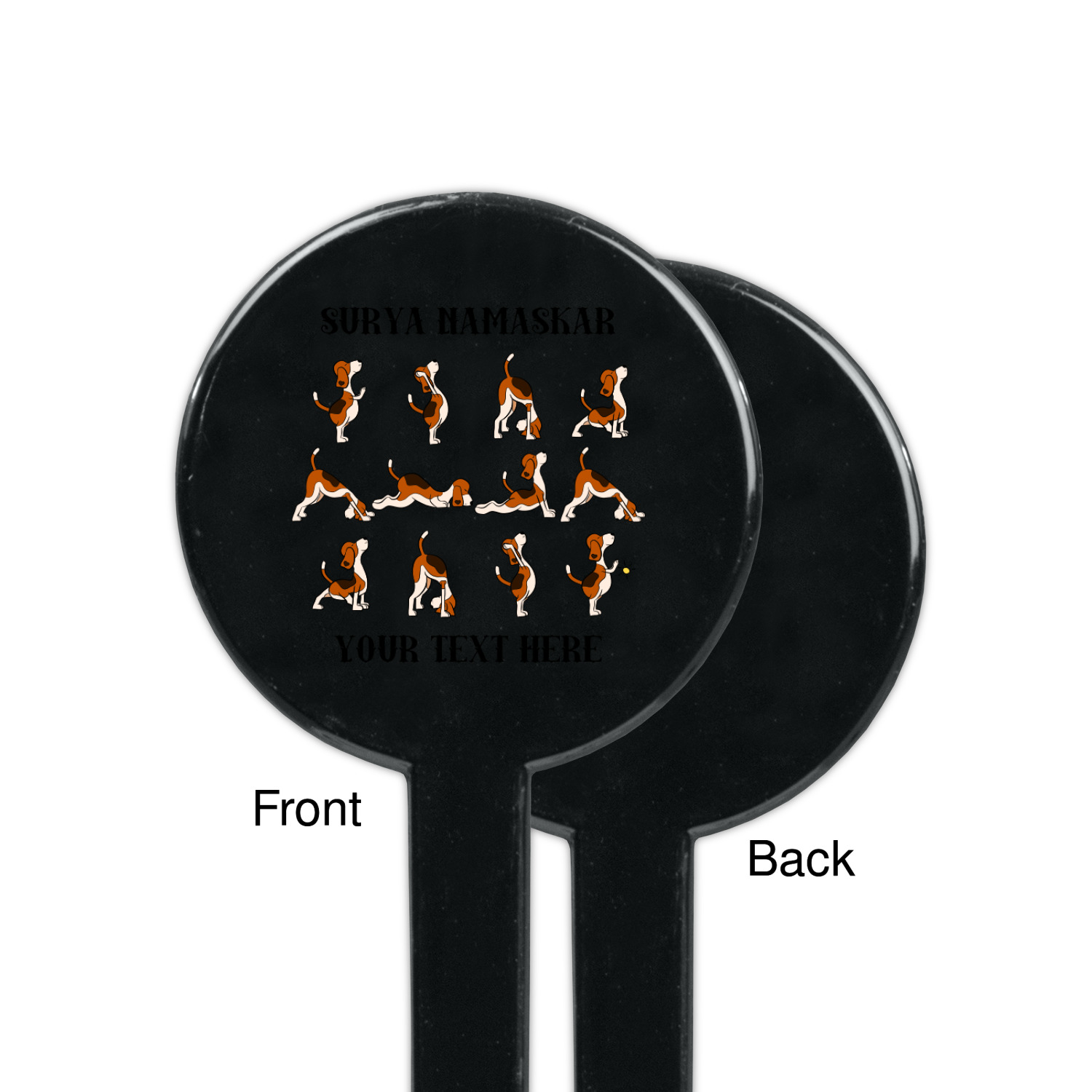 This design has a bright and happy background with little suns that are light yellow, while the rest is a slightly darker bright yellow. The main piece of the design is the set of adorable dogs doing yoga in several different positions. Your personalization goes above and below these graphics.