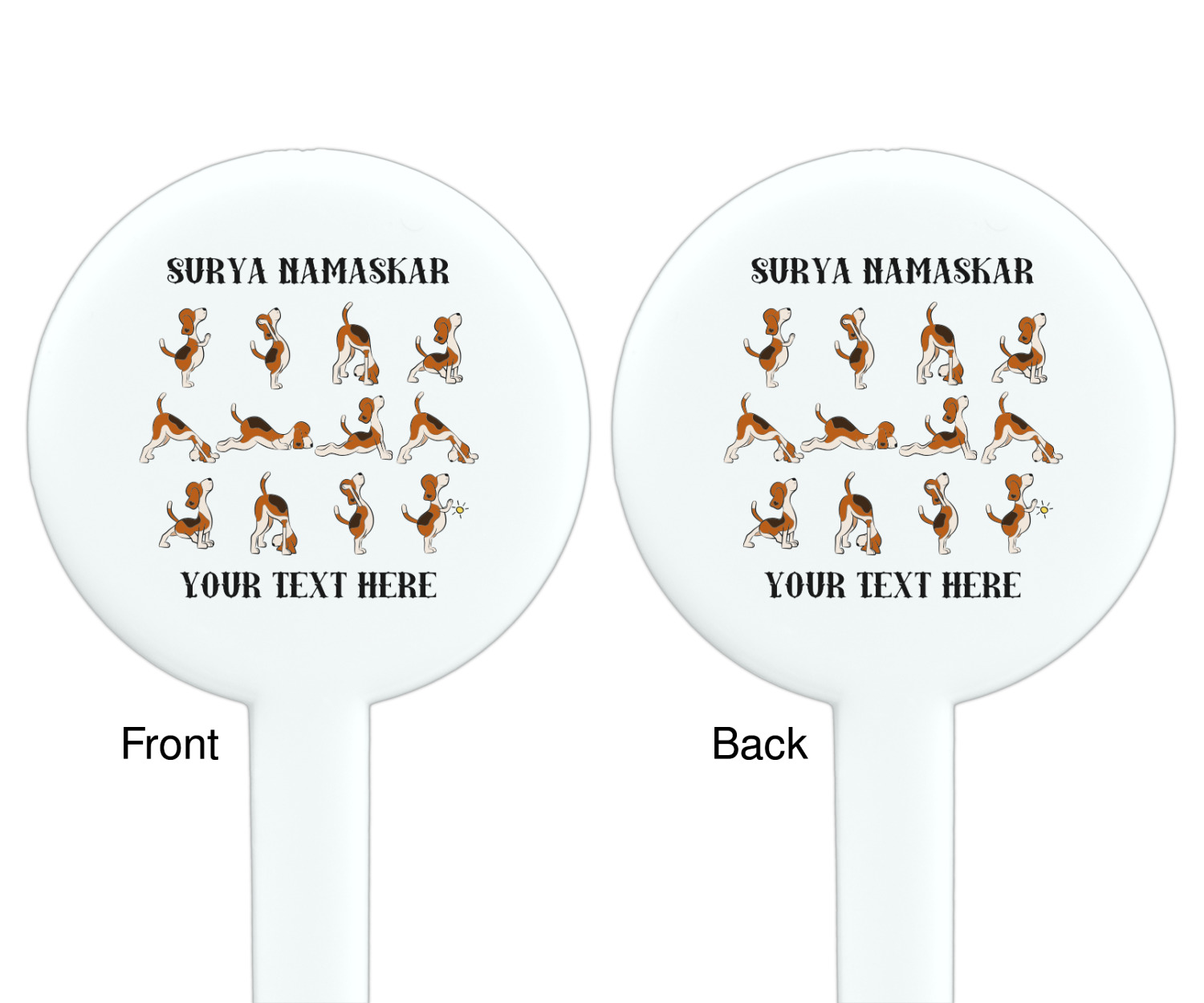 This design has a bright and happy background with little suns that are light yellow, while the rest is a slightly darker bright yellow. The main piece of the design is the set of adorable dogs doing yoga in several different positions. Your personalization goes above and below these graphics.