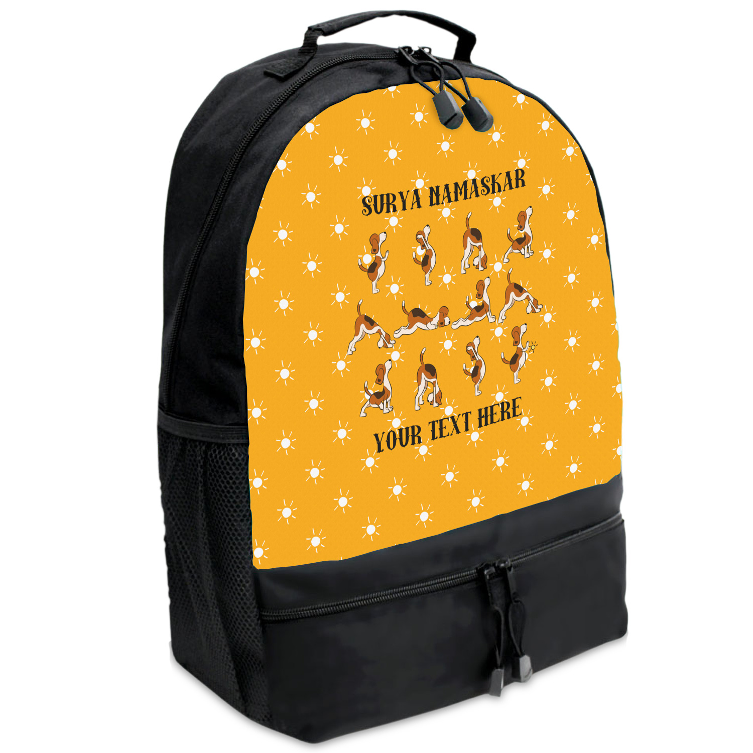 This design has a bright and happy background with little suns that are light yellow, while the rest is a slightly darker bright yellow. The main piece of the design is the set of adorable dogs doing yoga in several different positions. Your personalization goes above and below these graphics.