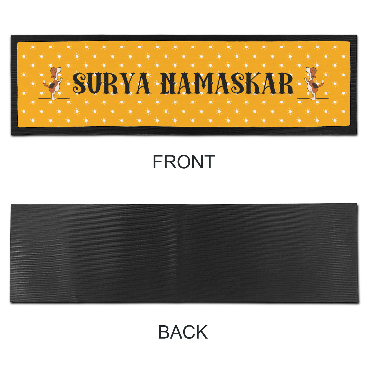 This design has a bright and happy background with little suns that are light yellow, while the rest is a slightly darker bright yellow. The main piece of the design is the set of adorable dogs doing yoga in several different positions. Your personalization goes above and below these graphics.