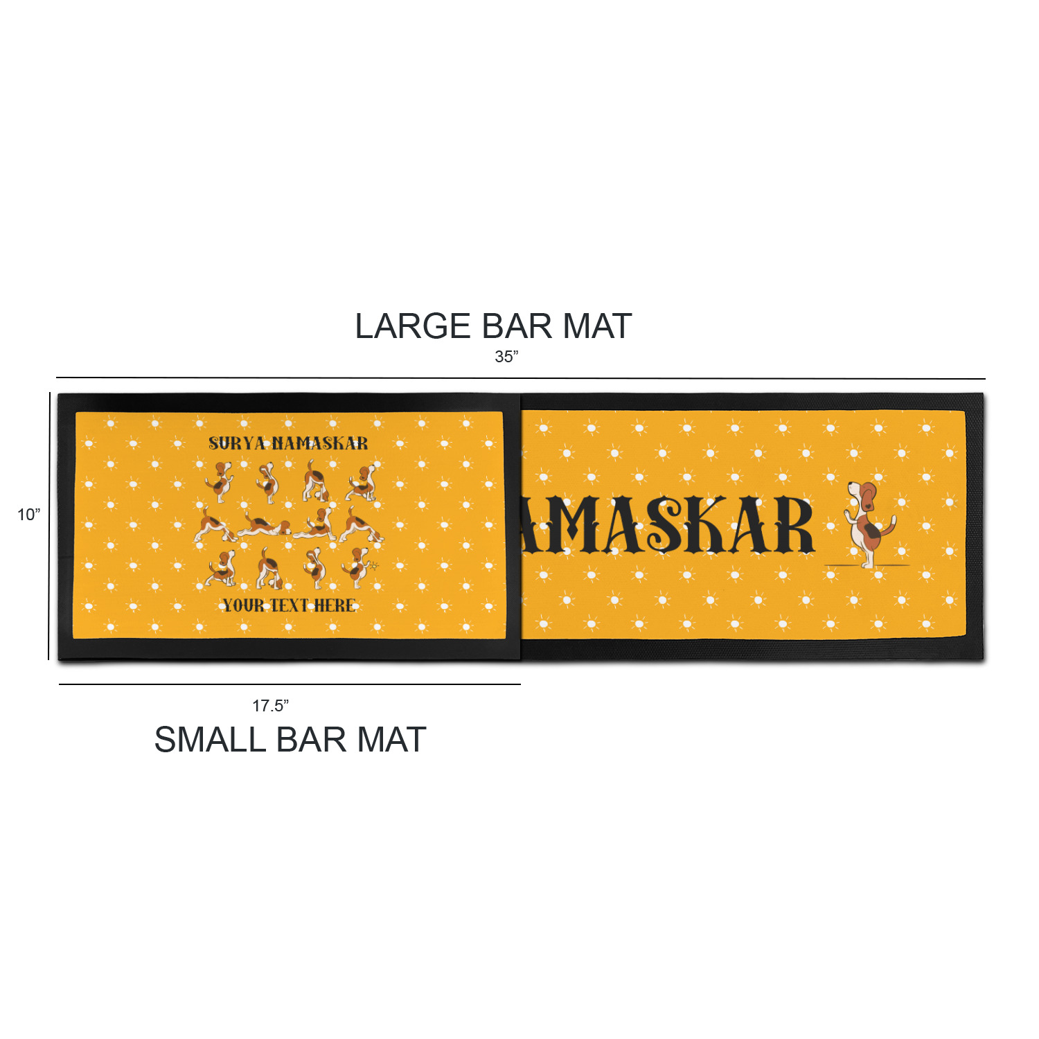 This design has a bright and happy background with little suns that are light yellow, while the rest is a slightly darker bright yellow. The main piece of the design is the set of adorable dogs doing yoga in several different positions. Your personalization goes above and below these graphics.