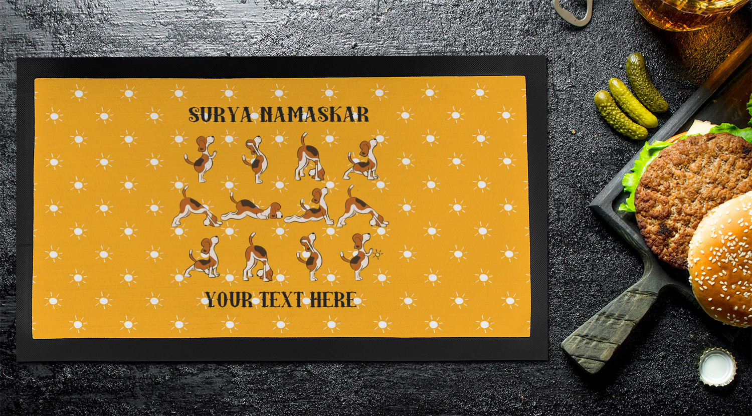 This design has a bright and happy background with little suns that are light yellow, while the rest is a slightly darker bright yellow. The main piece of the design is the set of adorable dogs doing yoga in several different positions. Your personalization goes above and below these graphics.
