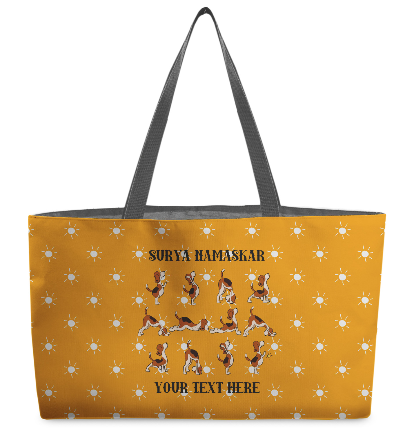 This design has a bright and happy background with little suns that are light yellow, while the rest is a slightly darker bright yellow. The main piece of the design is the set of adorable dogs doing yoga in several different positions. Your personalization goes above and below these graphics.