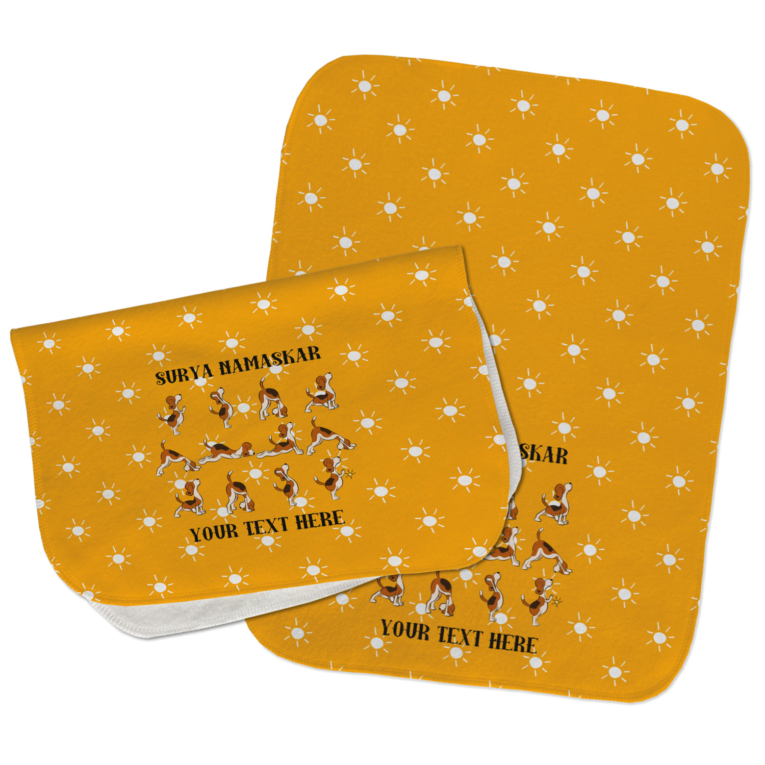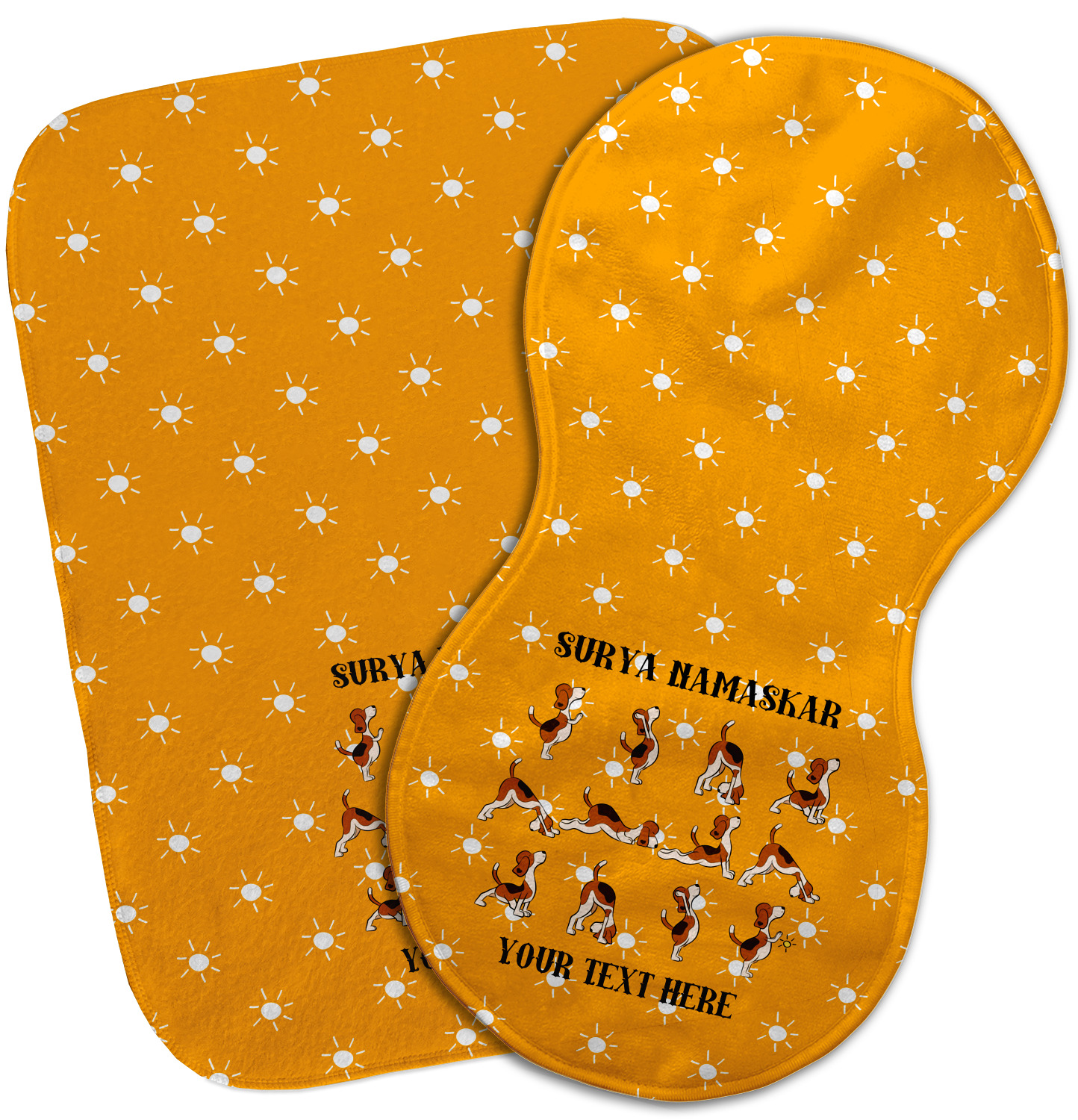 This design has a bright and happy background with little suns that are light yellow, while the rest is a slightly darker bright yellow. The main piece of the design is the set of adorable dogs doing yoga in several different positions. Your personalization goes above and below these graphics.