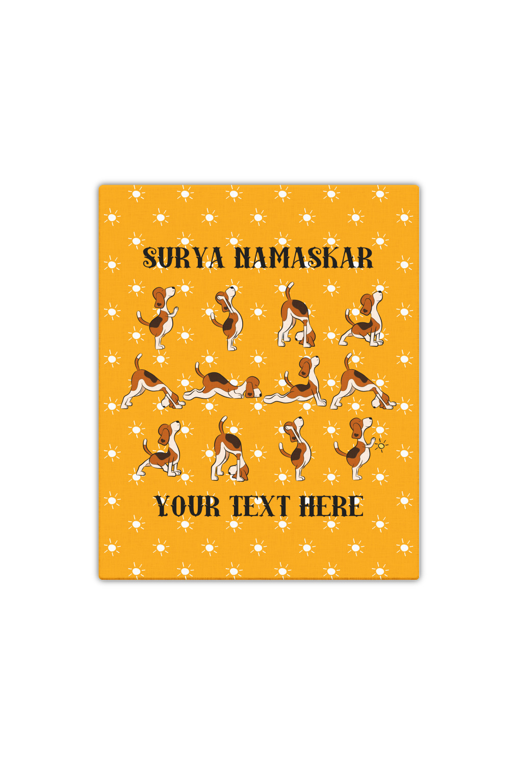This design has a bright and happy background with little suns that are light yellow, while the rest is a slightly darker bright yellow. The main piece of the design is the set of adorable dogs doing yoga in several different positions. Your personalization goes above and below these graphics.