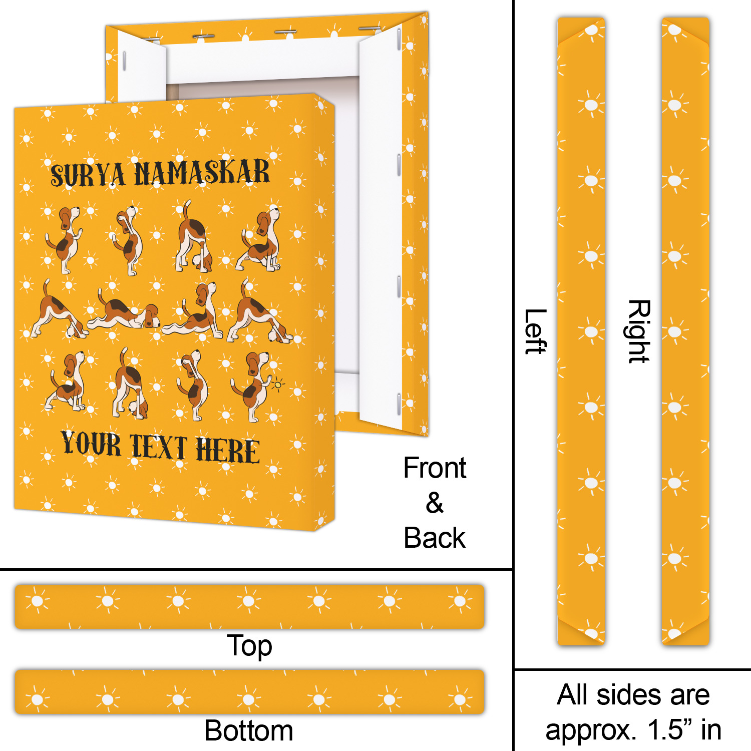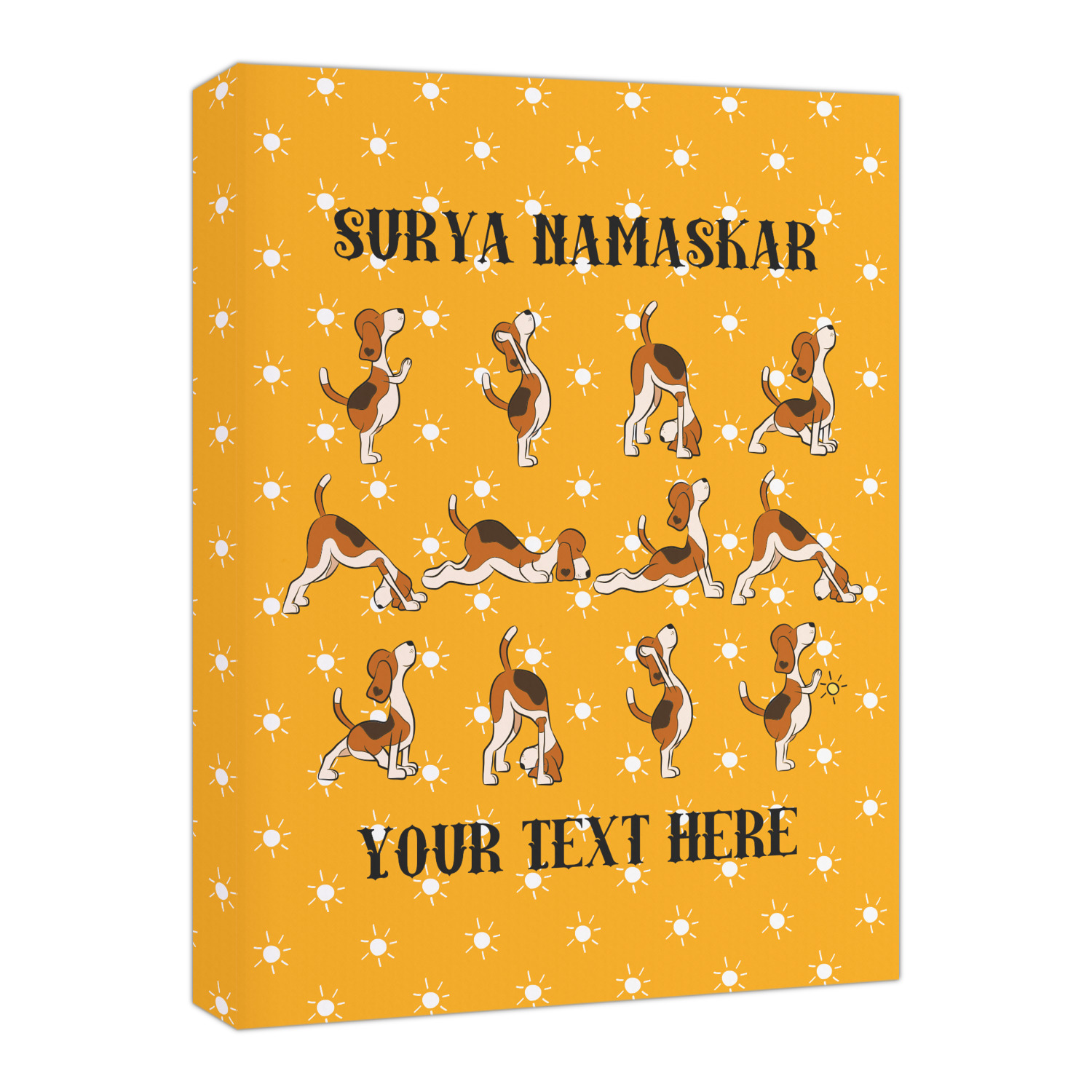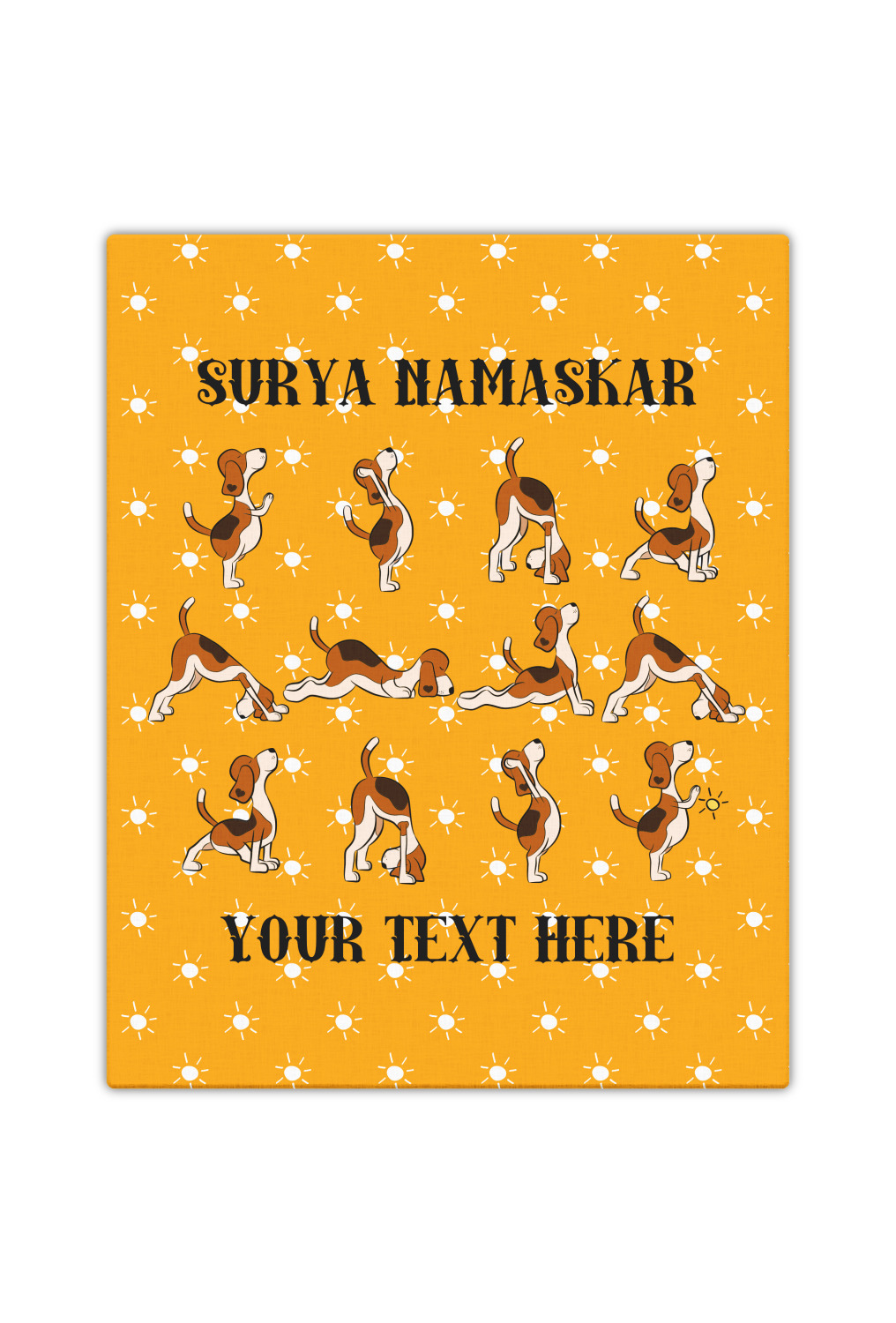 This design has a bright and happy background with little suns that are light yellow, while the rest is a slightly darker bright yellow. The main piece of the design is the set of adorable dogs doing yoga in several different positions. Your personalization goes above and below these graphics.