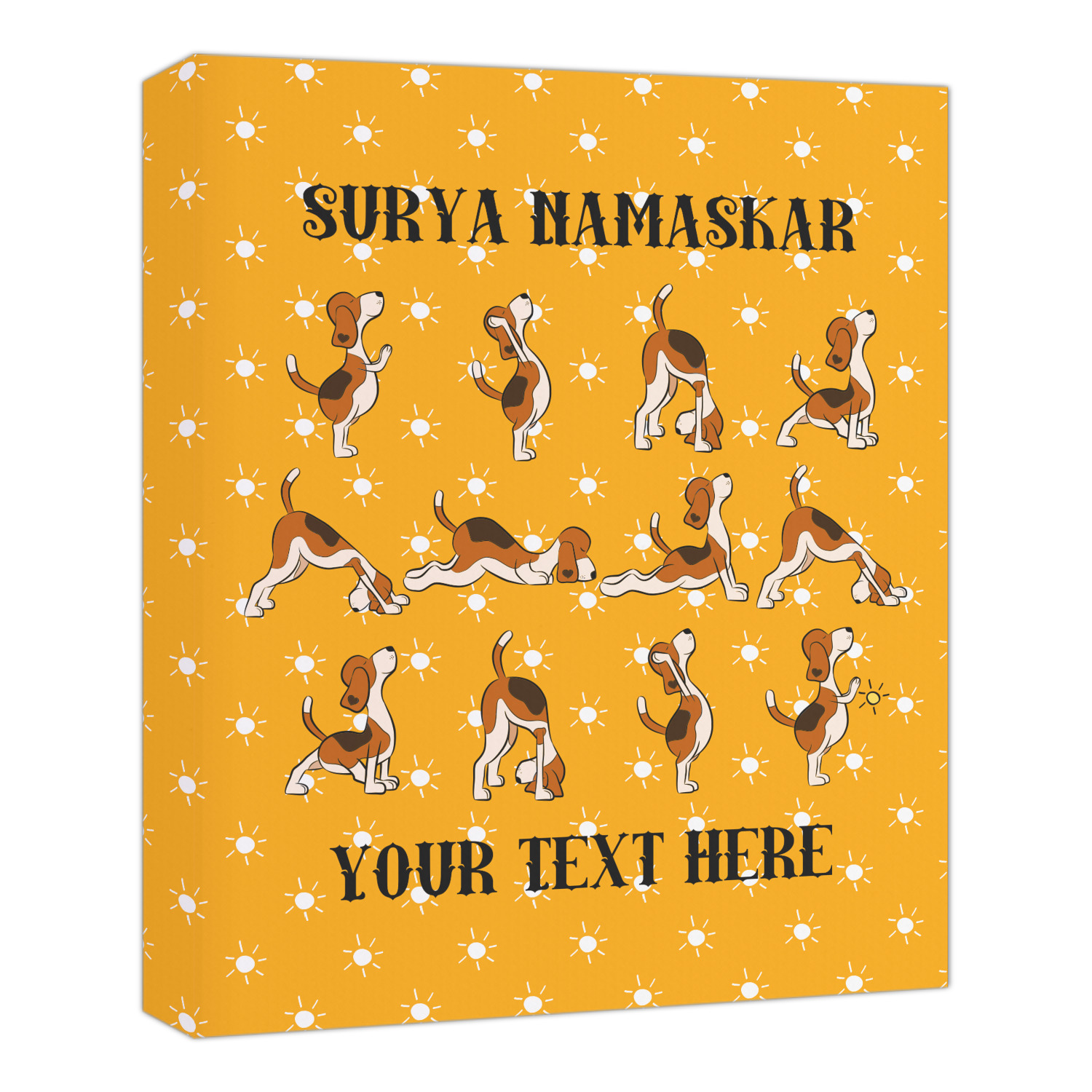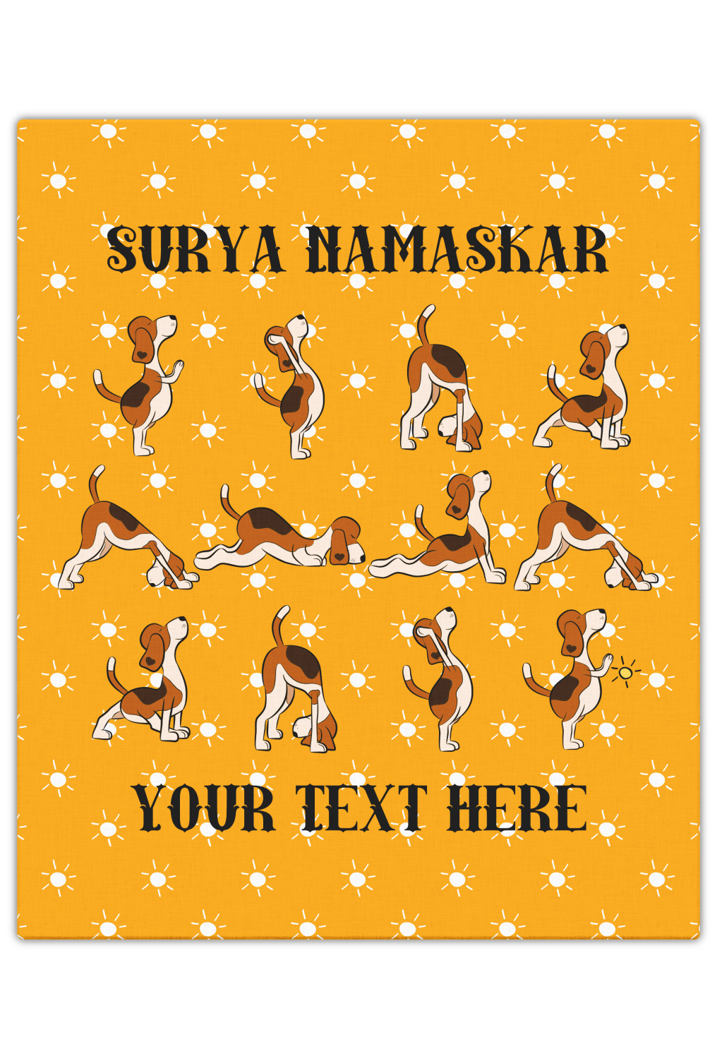 This design has a bright and happy background with little suns that are light yellow, while the rest is a slightly darker bright yellow. The main piece of the design is the set of adorable dogs doing yoga in several different positions. Your personalization goes above and below these graphics.