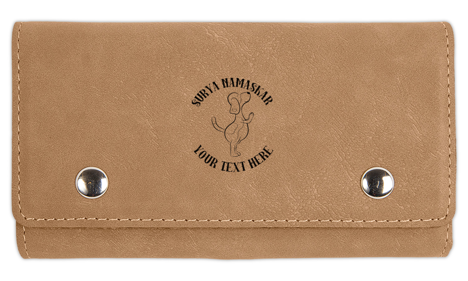 This design has a bright and happy background with little suns that are light yellow, while the rest is a slightly darker bright yellow. The main piece of the design is the set of adorable dogs doing yoga in several different positions. Your personalization goes above and below these graphics.