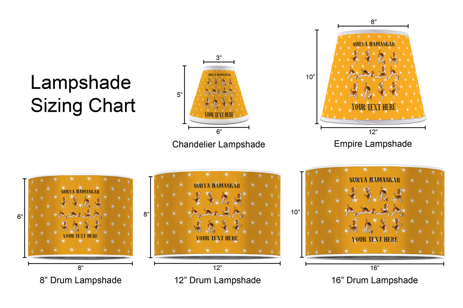 This design has a bright and happy background with little suns that are light yellow, while the rest is a slightly darker bright yellow. The main piece of the design is the set of adorable dogs doing yoga in several different positions. Your personalization goes above and below these graphics.