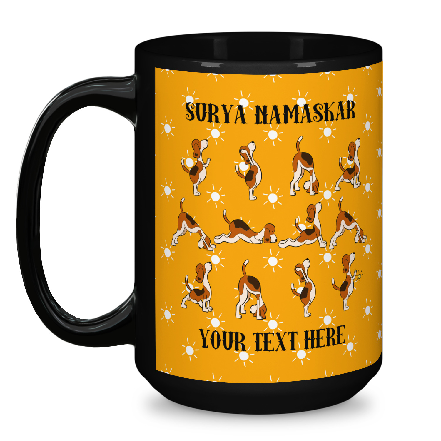 This design has a bright and happy background with little suns that are light yellow, while the rest is a slightly darker bright yellow. The main piece of the design is the set of adorable dogs doing yoga in several different positions. Your personalization goes above and below these graphics.