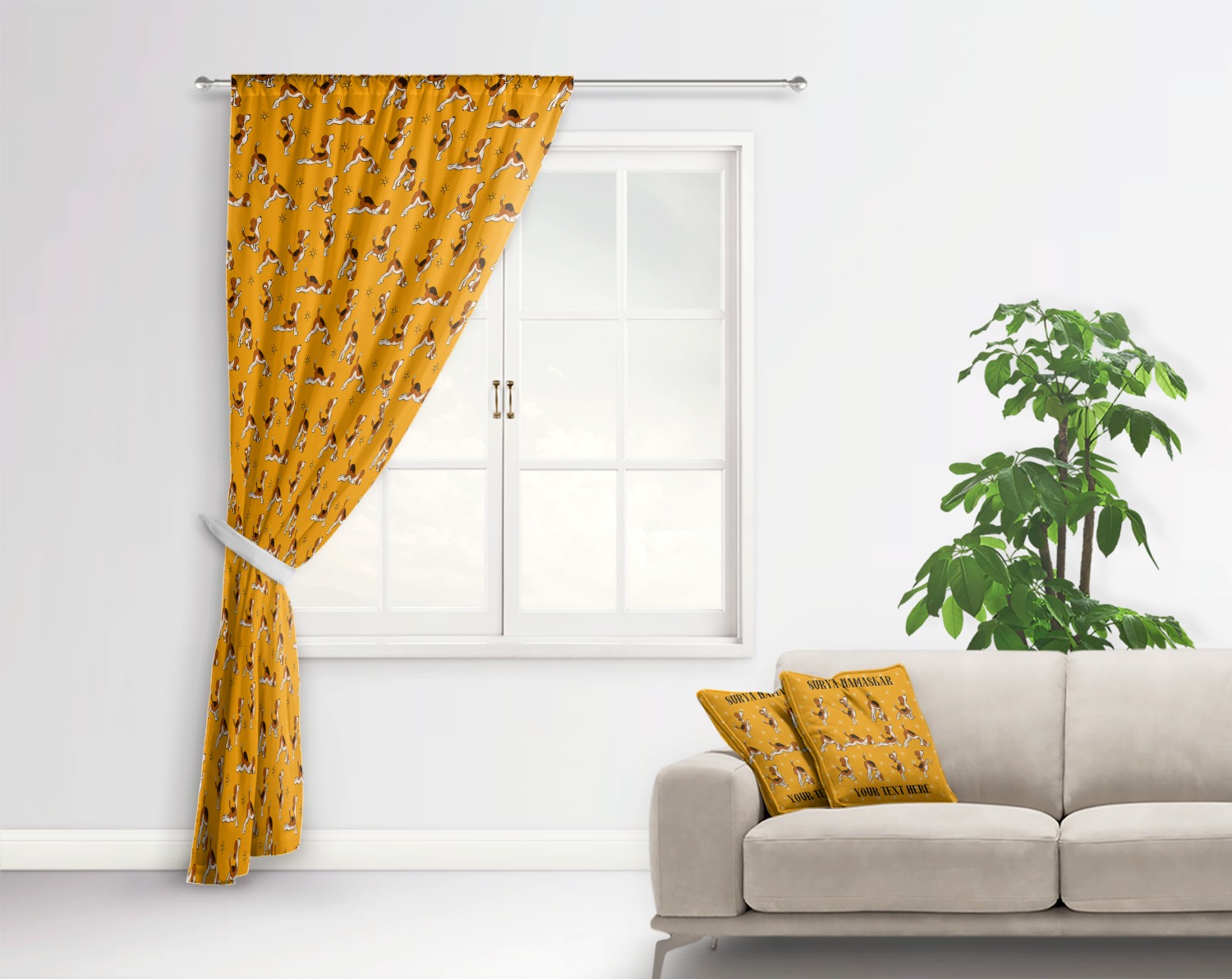 This design has a bright and happy background with little suns that are light yellow, while the rest is a slightly darker bright yellow. The main piece of the design is the set of adorable dogs doing yoga in several different positions. Your personalization goes above and below these graphics.