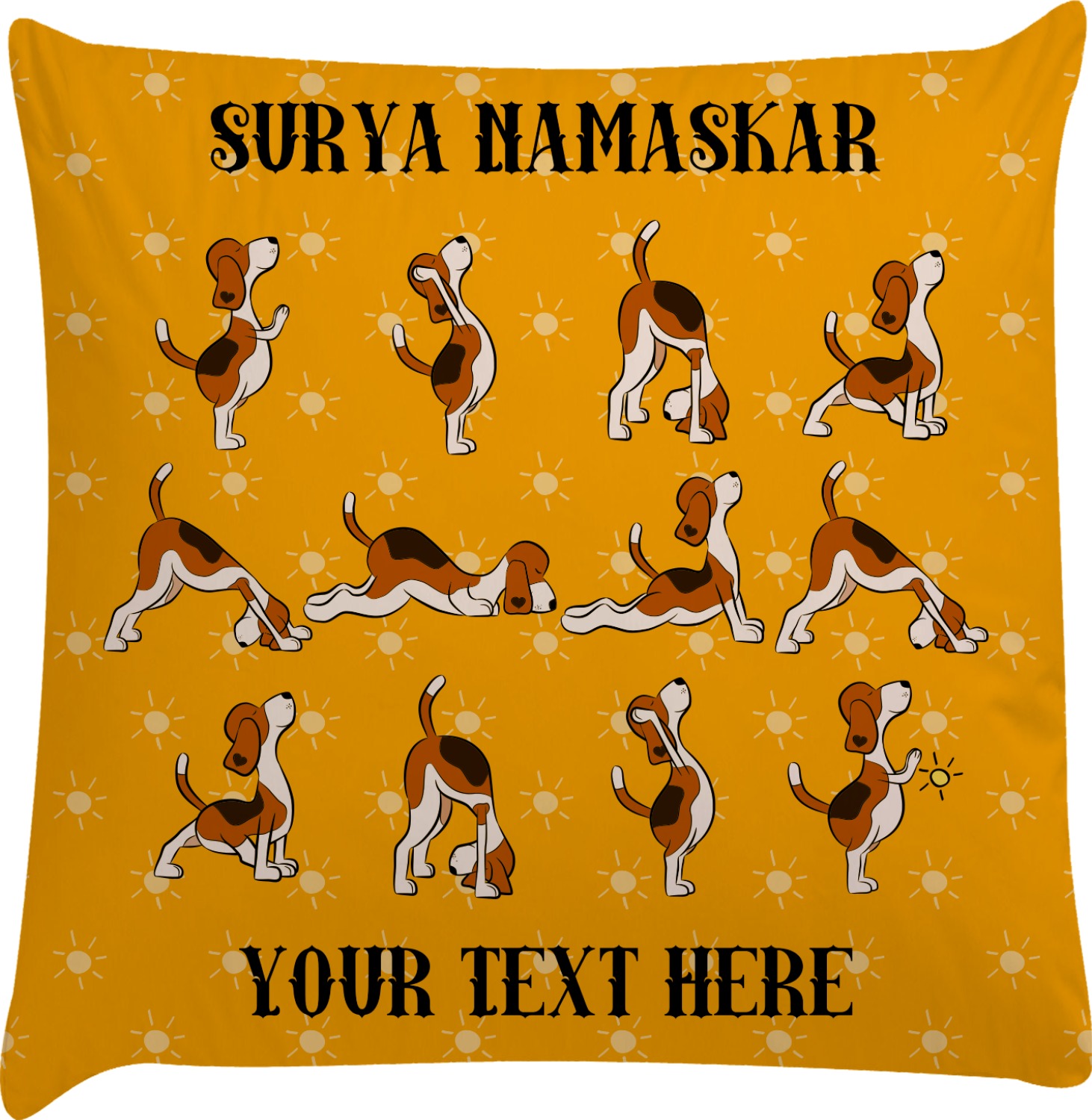 This design has a bright and happy background with little suns that are light yellow, while the rest is a slightly darker bright yellow. The main piece of the design is the set of adorable dogs doing yoga in several different positions. Your personalization goes above and below these graphics.