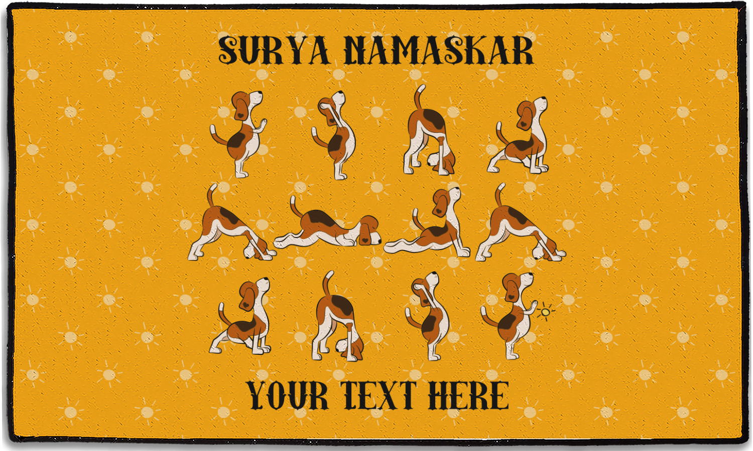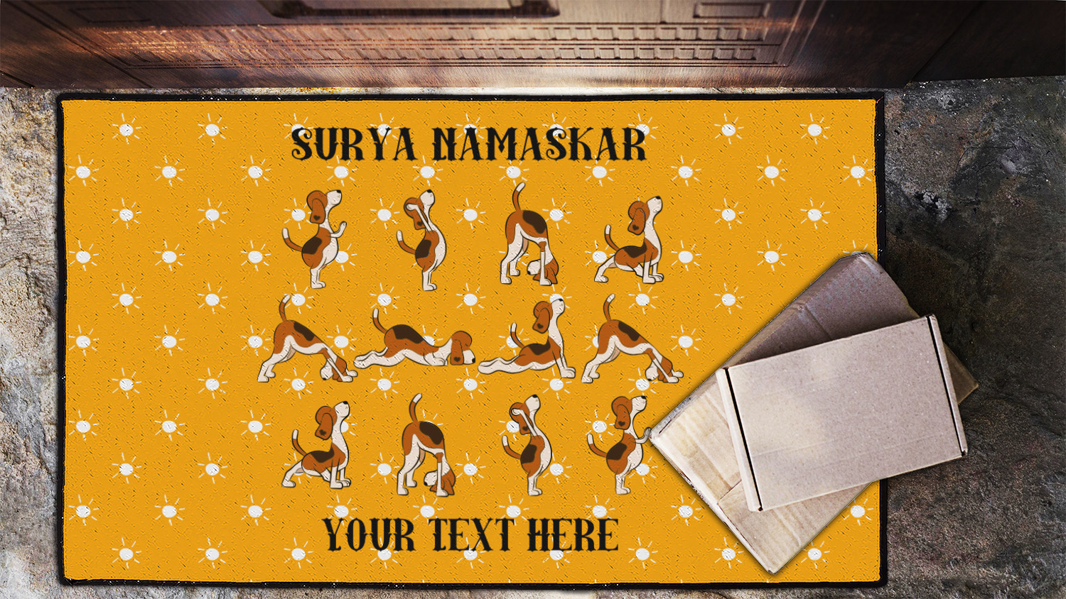 This design has a bright and happy background with little suns that are light yellow, while the rest is a slightly darker bright yellow. The main piece of the design is the set of adorable dogs doing yoga in several different positions. Your personalization goes above and below these graphics.