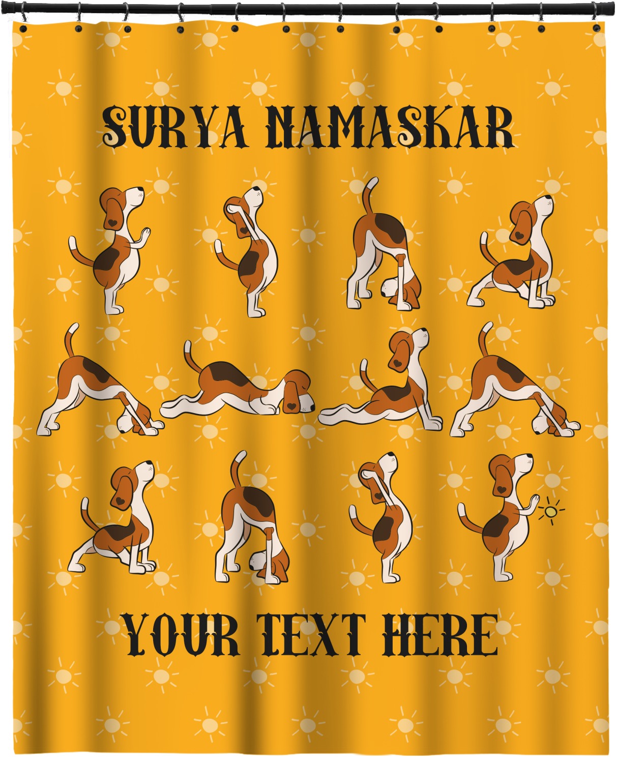 This design has a bright and happy background with little suns that are light yellow, while the rest is a slightly darker bright yellow. The main piece of the design is the set of adorable dogs doing yoga in several different positions. Your personalization goes above and below these graphics.