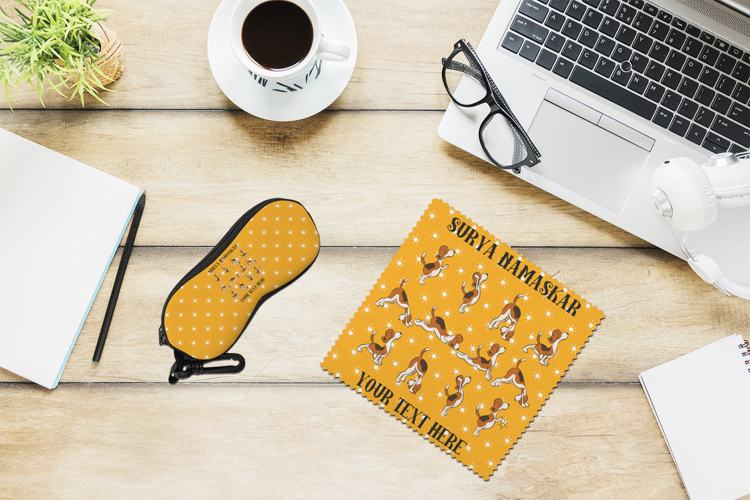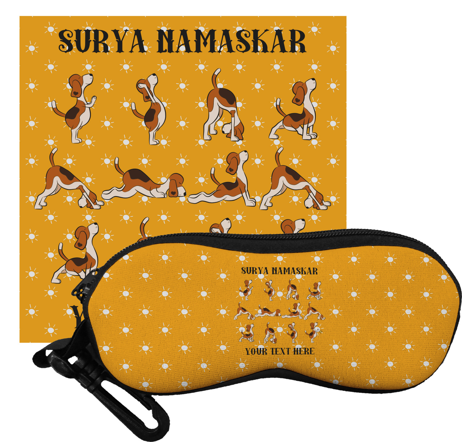 This design has a bright and happy background with little suns that are light yellow, while the rest is a slightly darker bright yellow. The main piece of the design is the set of adorable dogs doing yoga in several different positions. Your personalization goes above and below these graphics.