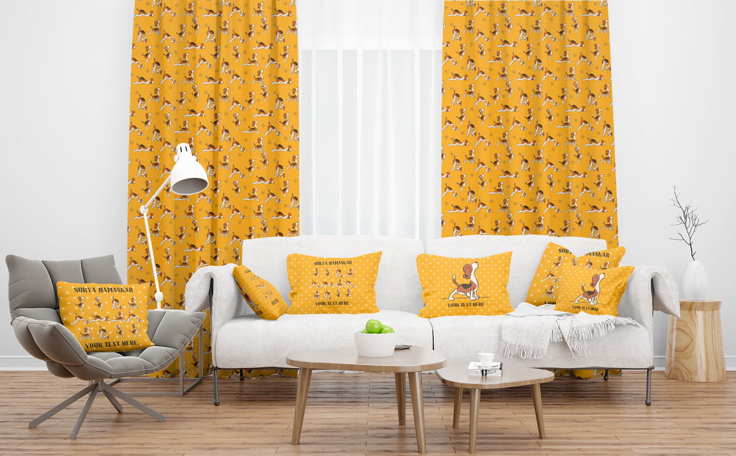 This design has a bright and happy background with little suns that are light yellow, while the rest is a slightly darker bright yellow. The main piece of the design is the set of adorable dogs doing yoga in several different positions. Your personalization goes above and below these graphics.