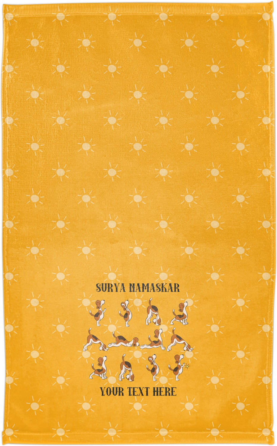 This design has a bright and happy background with little suns that are light yellow, while the rest is a slightly darker bright yellow. The main piece of the design is the set of adorable dogs doing yoga in several different positions. Your personalization goes above and below these graphics.
