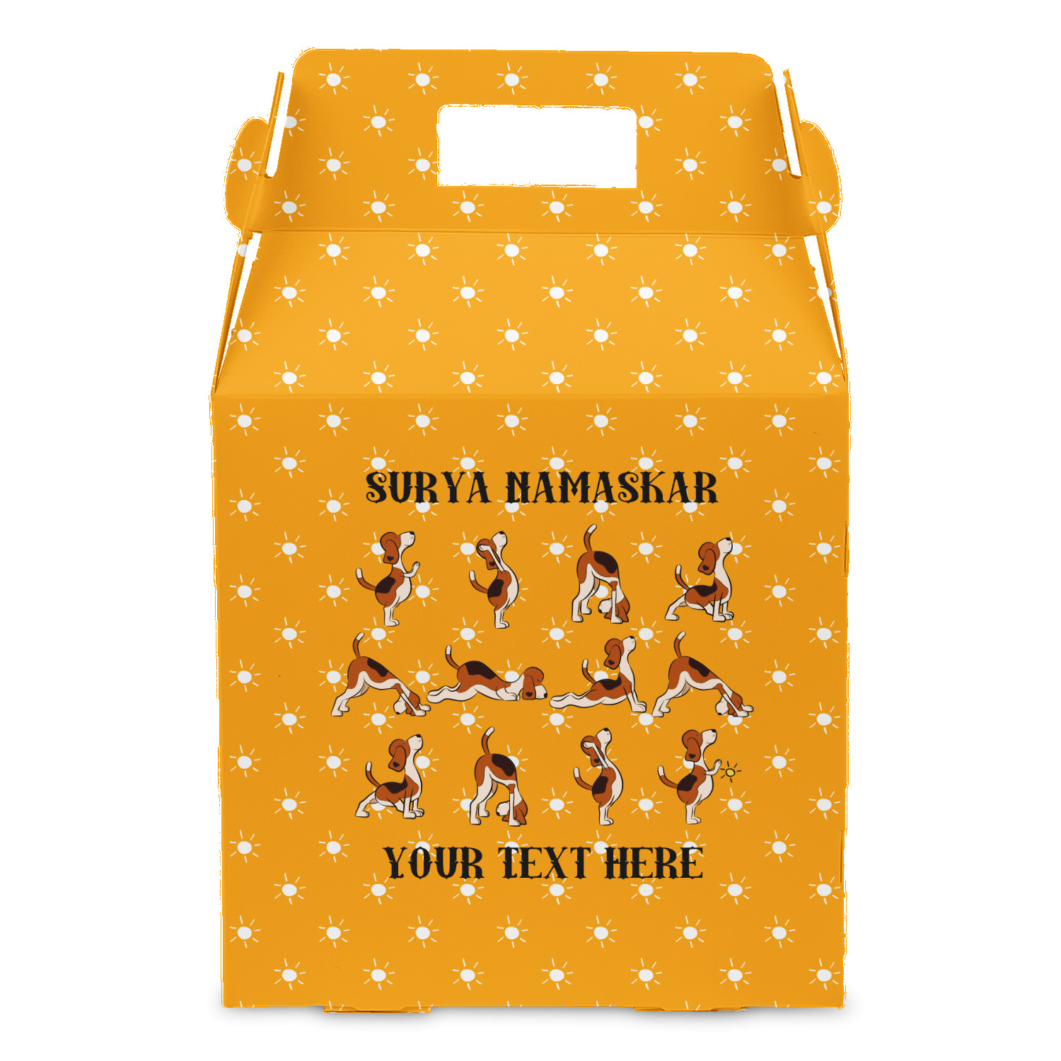 This design has a bright and happy background with little suns that are light yellow, while the rest is a slightly darker bright yellow. The main piece of the design is the set of adorable dogs doing yoga in several different positions. Your personalization goes above and below these graphics.