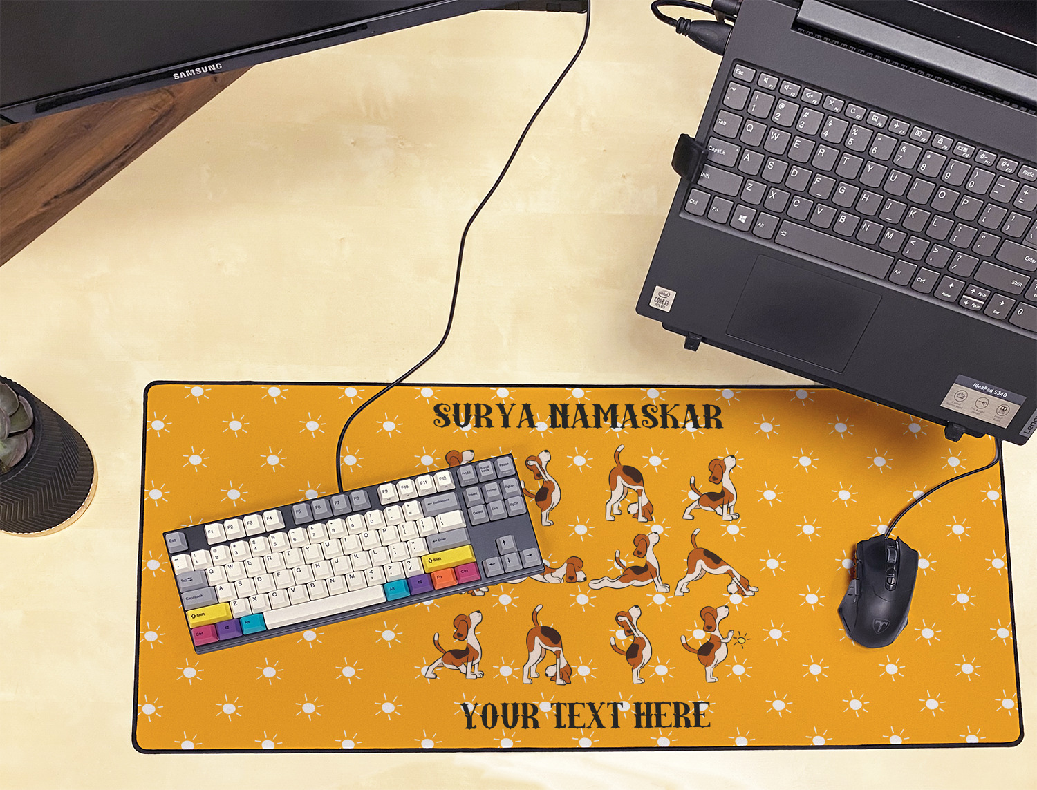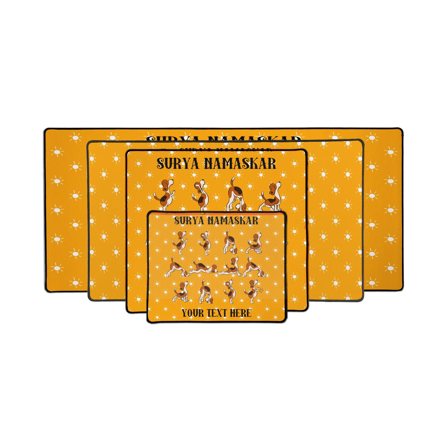 This design has a bright and happy background with little suns that are light yellow, while the rest is a slightly darker bright yellow. The main piece of the design is the set of adorable dogs doing yoga in several different positions. Your personalization goes above and below these graphics.